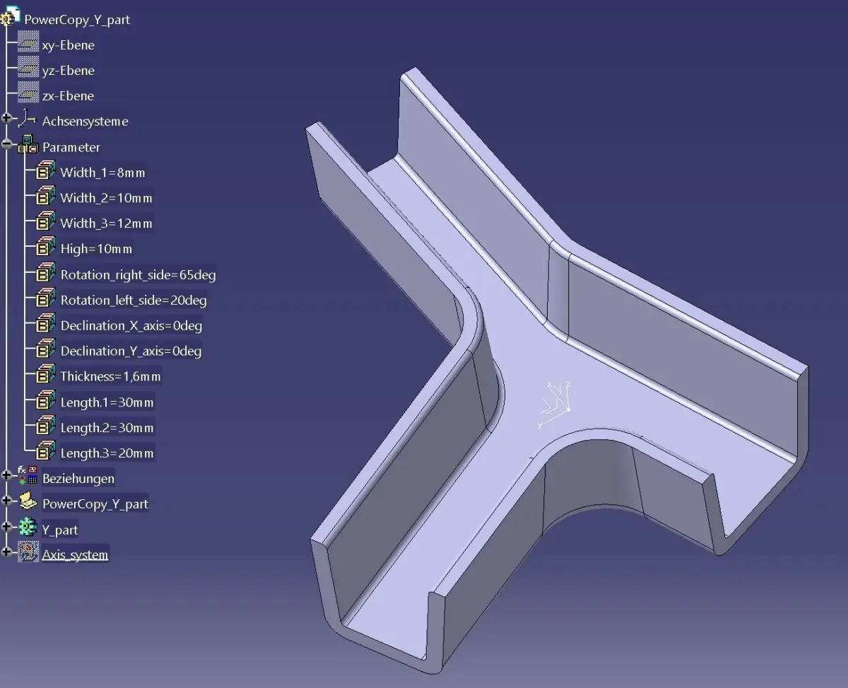 Parametrischer Y Part für Scheinwerfer und andre Produkte – 3D-CAD-ModellProduktbeschreibungDieser hochwertige, parametrische Y Part ist speziell für den Einsatz in Scheinwerferkonstruktionen und Fahrzeugbeleuchtungssystemen entwickelt. Er bietet eine passgenaue und wiederverwendbare Geometrie, die eine einfache Integration in verschiedene Beleuchtungssysteme ermöglicht. Dank des parametrischen Designs kann die Geometrie flexibel angepasst und in verschiedene Konstruktionen eingebunden werden.Hauptmerkmale• Parametrisches Design – Anpassbar an spezifische Anforderungen und verschiedene Fahrzeugmodelle• Optimiert für PowerCopy-Technologie – Wiederverwendbare Struktur für effiziente Konstruktion• Hohe Präzision – Perfekt für die industrielle Fertigung (Spritzguss, CNC, 3D-Druck)• Einfache Integration – Enthält alle relevanten Achsen, Ebenen und Referenzpunkte• Modular & wiederverwendbar – Ideal für verschiedene ScheinwerferprojekteTechnische Details• Kompatibilität: Y-förmige Bauteile für Scheinwerferkonstruktionen• Präzise Geometrie: Optimiert für exakte Montage• Referenzelemente: Enthält Achsen, Ebenen und Bezugspunkte• Ebenen & Schnitte: Für einfache Modifikationen und BearbeitungenVerfügbare Dateiformate• CATIA (.CATPart) – Auf Anfrage verfügbar• Weitere Formate – Auf AnfrageAnwendungsbereiche• Automobil-Scheinwerfer & Beleuchtungssysteme• Maschinenbau & Produktdesign• Prototypen- & SerienfertigungVorteile• Effiziente Konstruktion – Spart Zeit und Entwicklungskosten• Höchste Qualität – Perfekt für professionelle Anwendungen• Flexibel einsetzbar – Für verschiedene Beleuchtungssysteme geeignetJetzt herunterladen und Ihre Konstruktion optimieren!