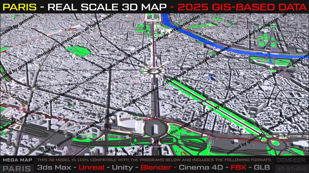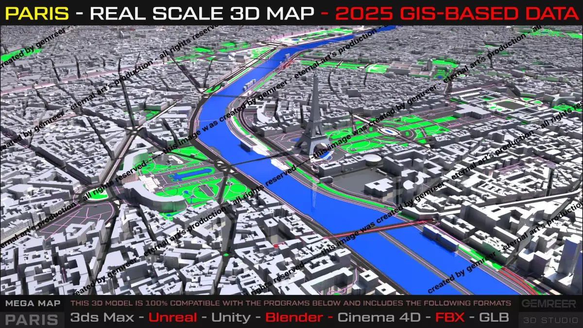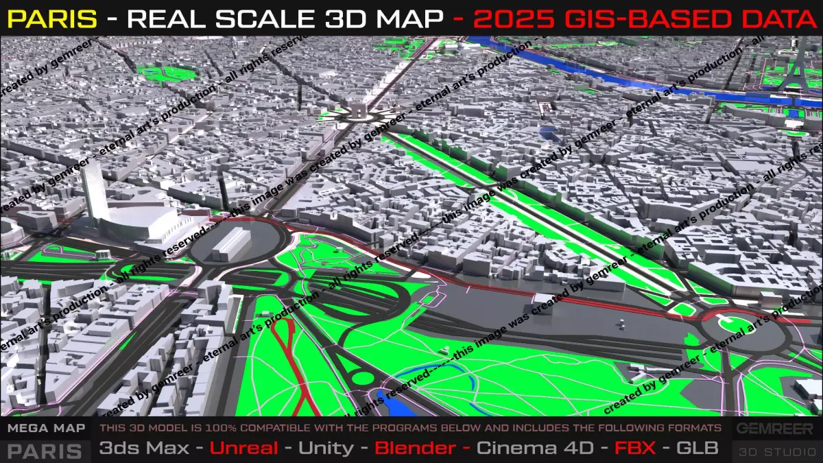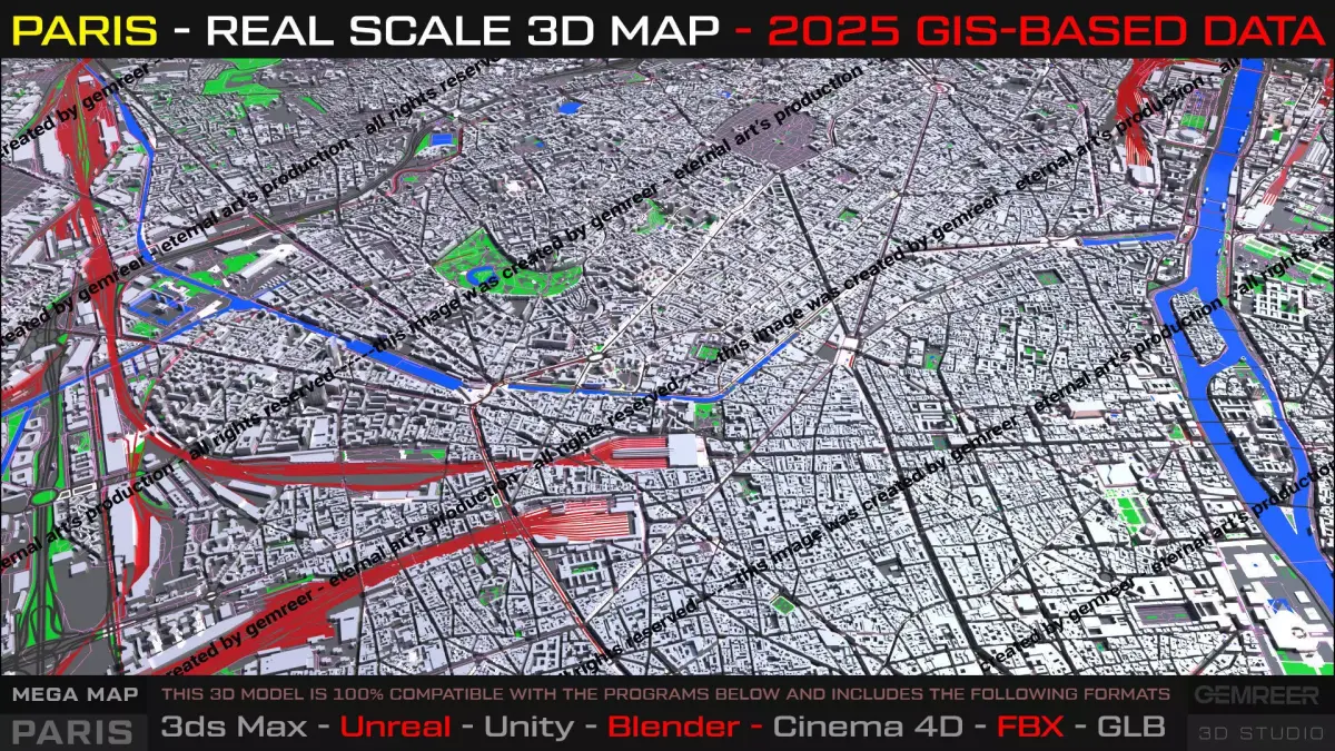 Paris 3D Map - Real Scale - 2025 Gis DataHigh-precision, data-driven 3D map of Paris, built from real GIS data.Includes rivers, parks, roads, and urban layers with clean topology and optimized geometry.