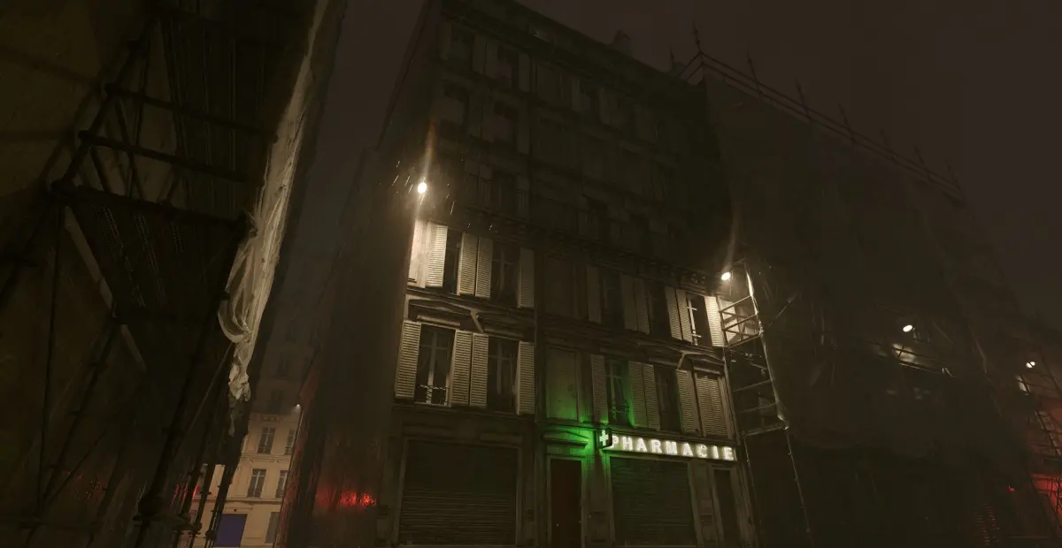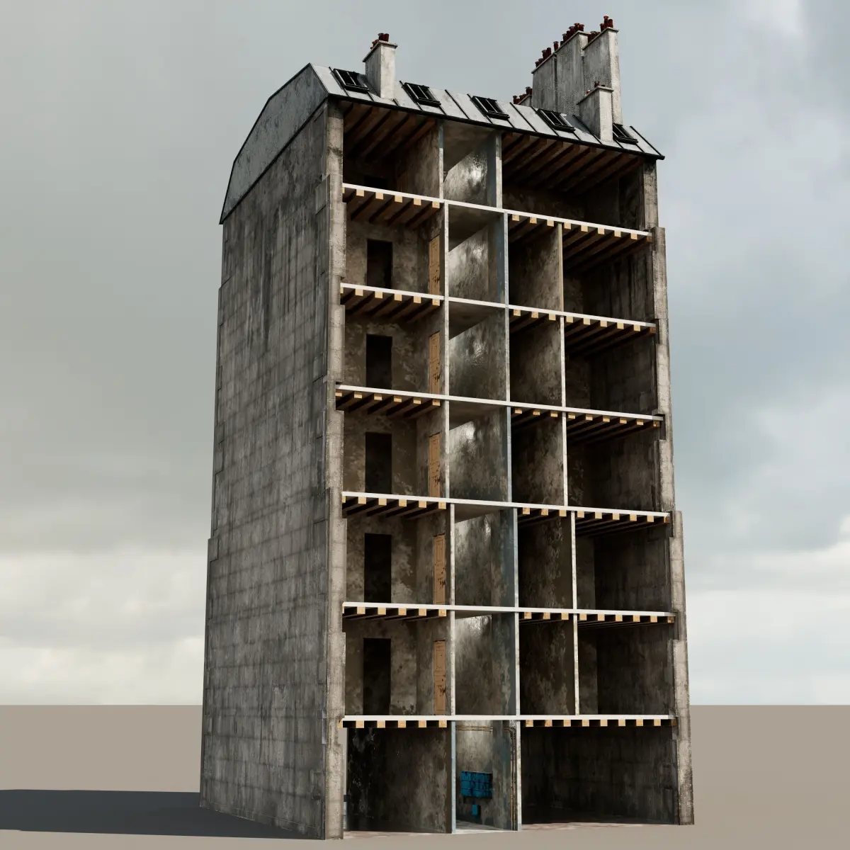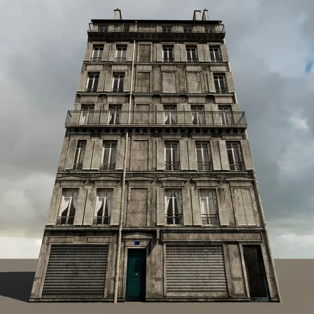 A double-fronted building in the Parisian style. With curtains, stairwell, floors and walls, mailbox and pipes.