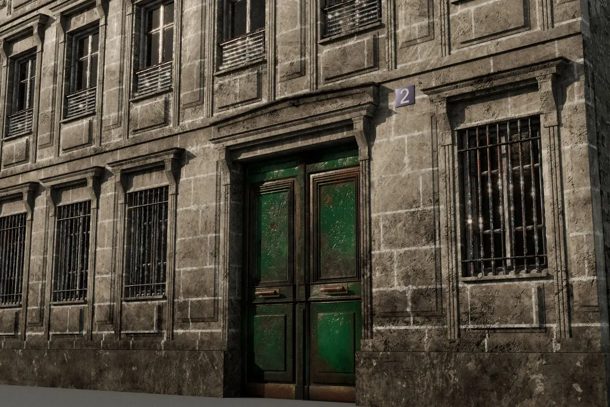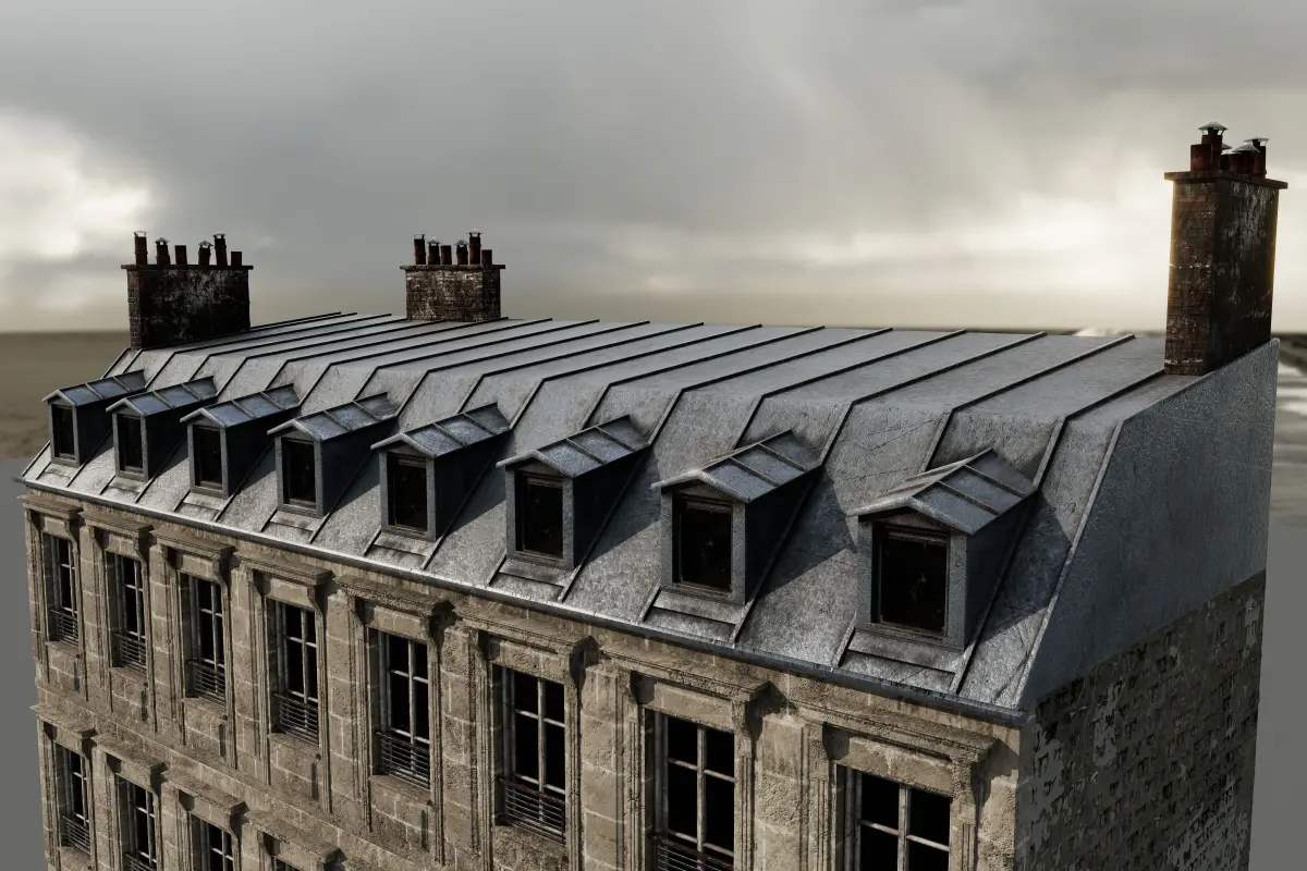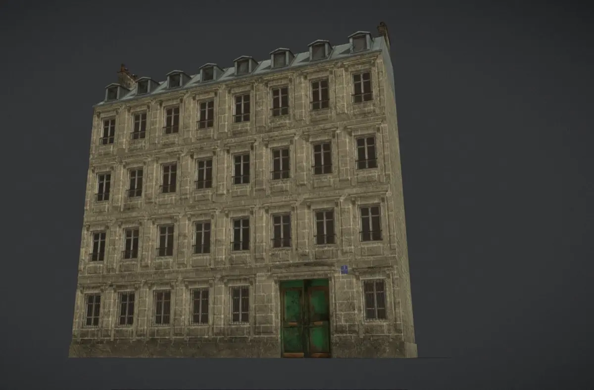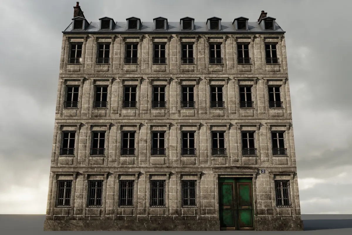 Brick and old concrete paint + plaster. 4 walls and roof. Old Paris building Middle size.
