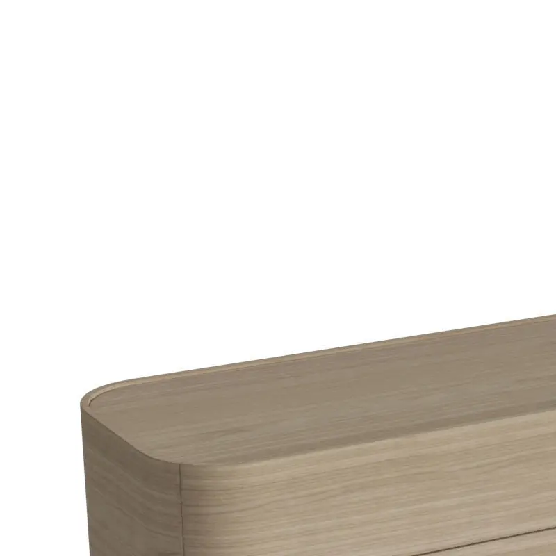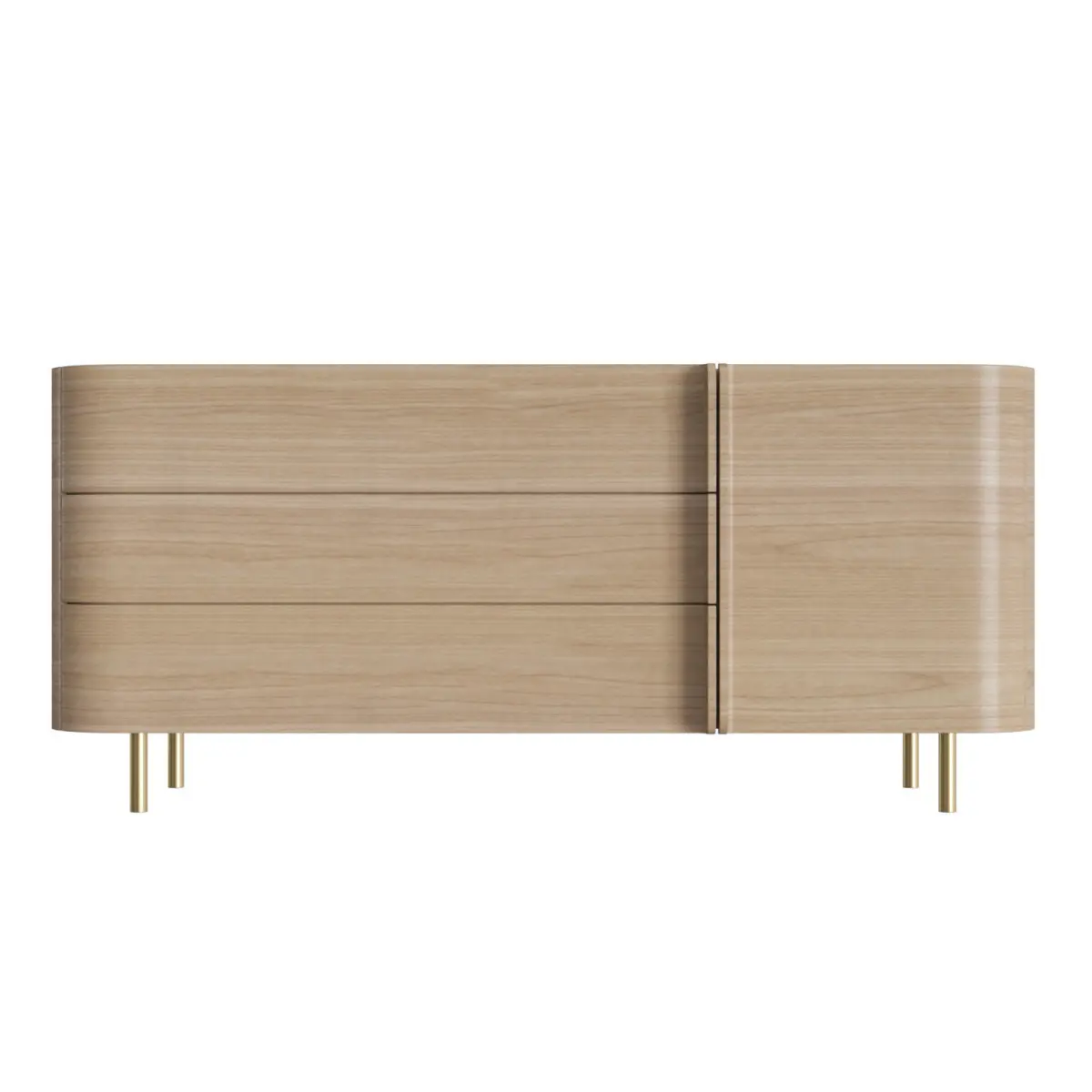 Structure in defibrated ash wood veneer on MDF, drawers and door in ash wood veneer on plywood, interior upholstered in leather. 1 wooden door with 1 adjustable wooden shelf (pegs), 3 drawers with push-to-open mechanism and metal rails, base in brushed brass or dark brushed brass.