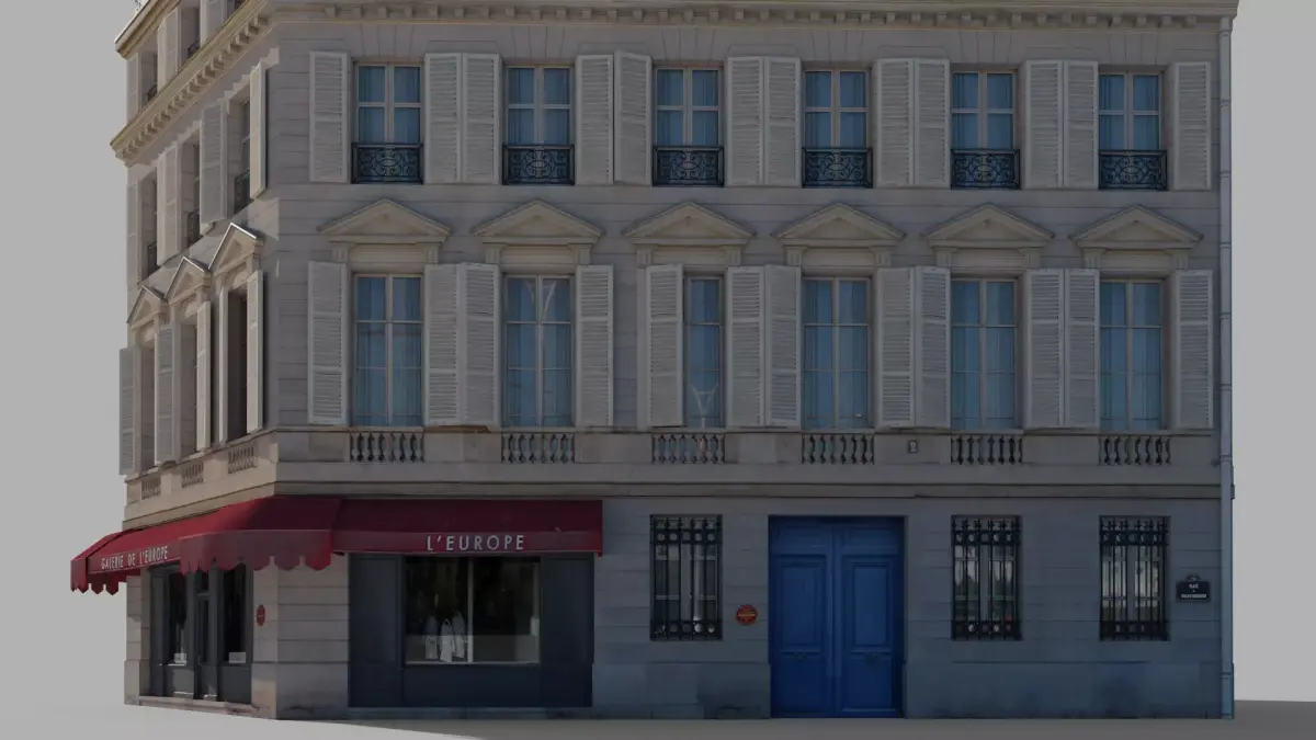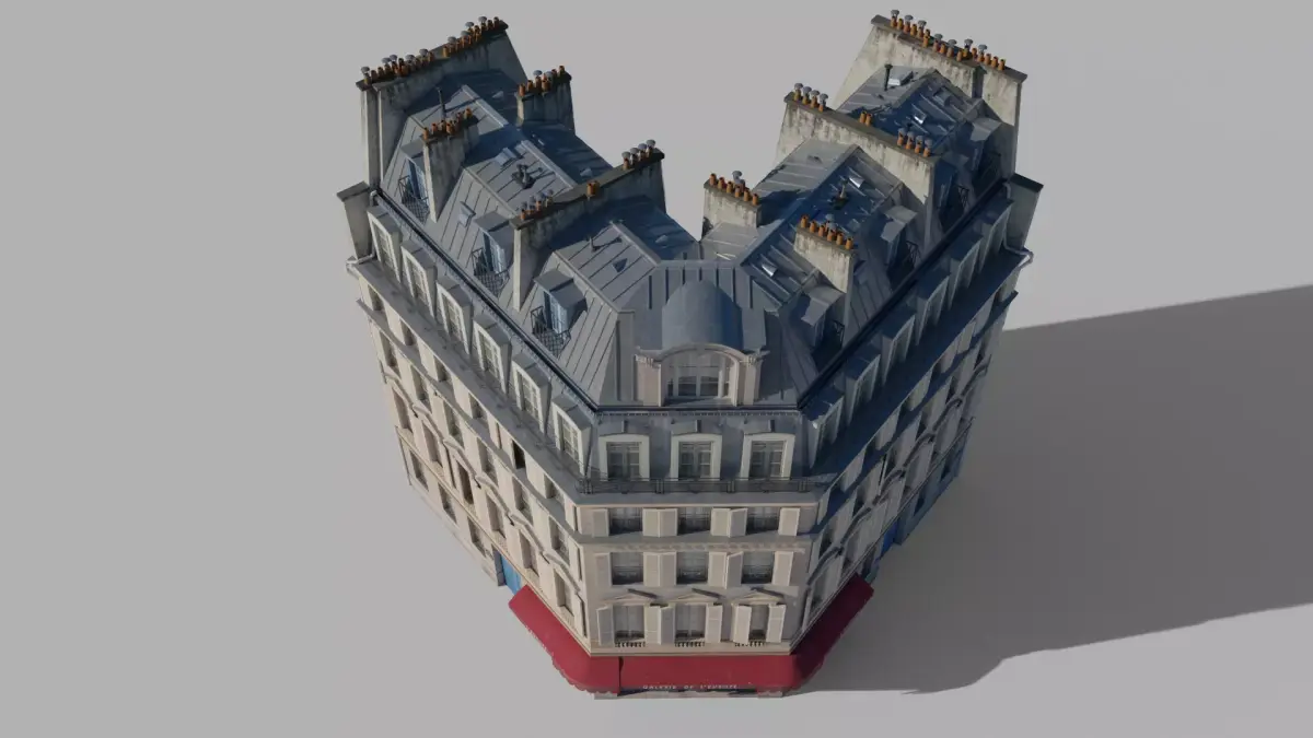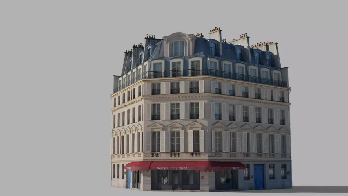 High-quality 3D model of a classic Parisian corner building. Perfect for urban visualizations, architectural projects, and games. The model represents Haussmann-style architecture with detailed facades, mansard windows, and ground-floor storefronts.