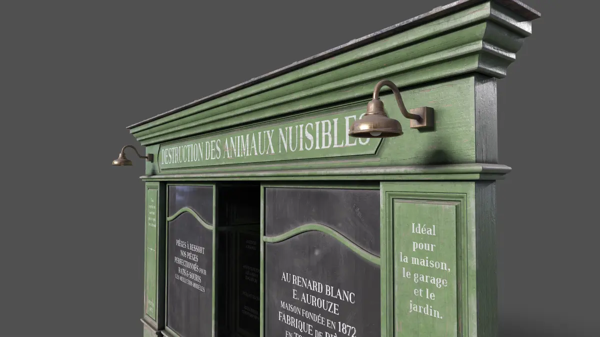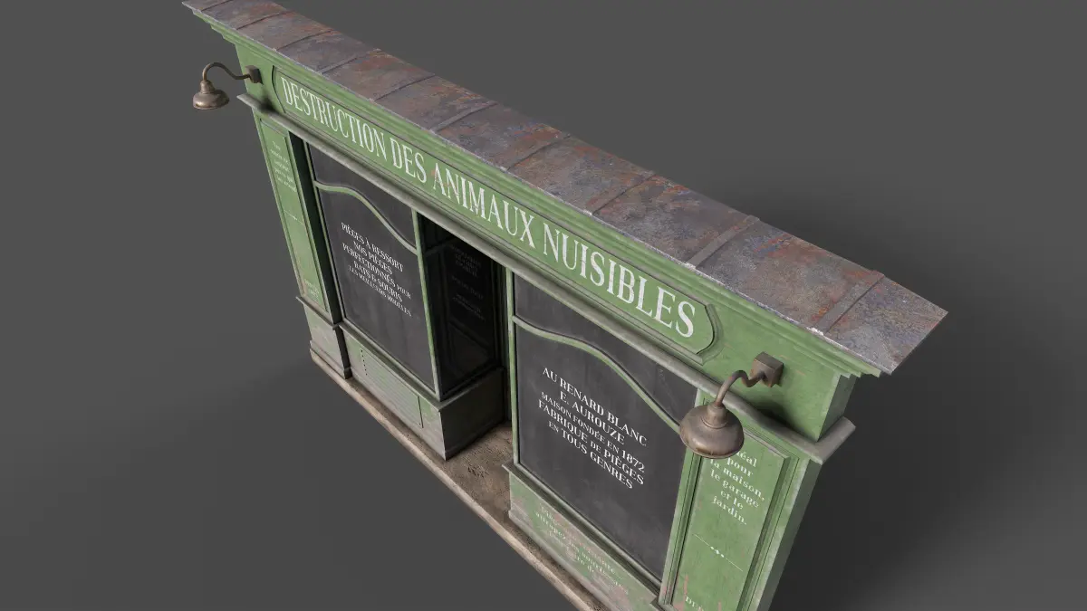 Bring the charm of Parisian streets to your projects with this highly detailed 3D model of the vintage storefront Destruction des Animaux Nuisibles. Perfect for architectural visualization, game environments, or animation scenes, this model captures the authentic look of a classic French shopfront.