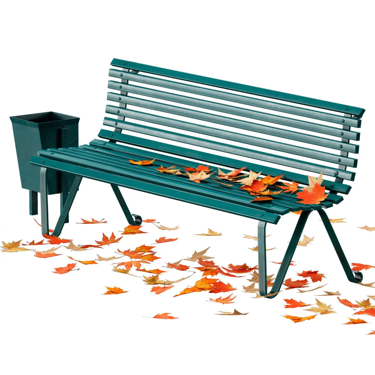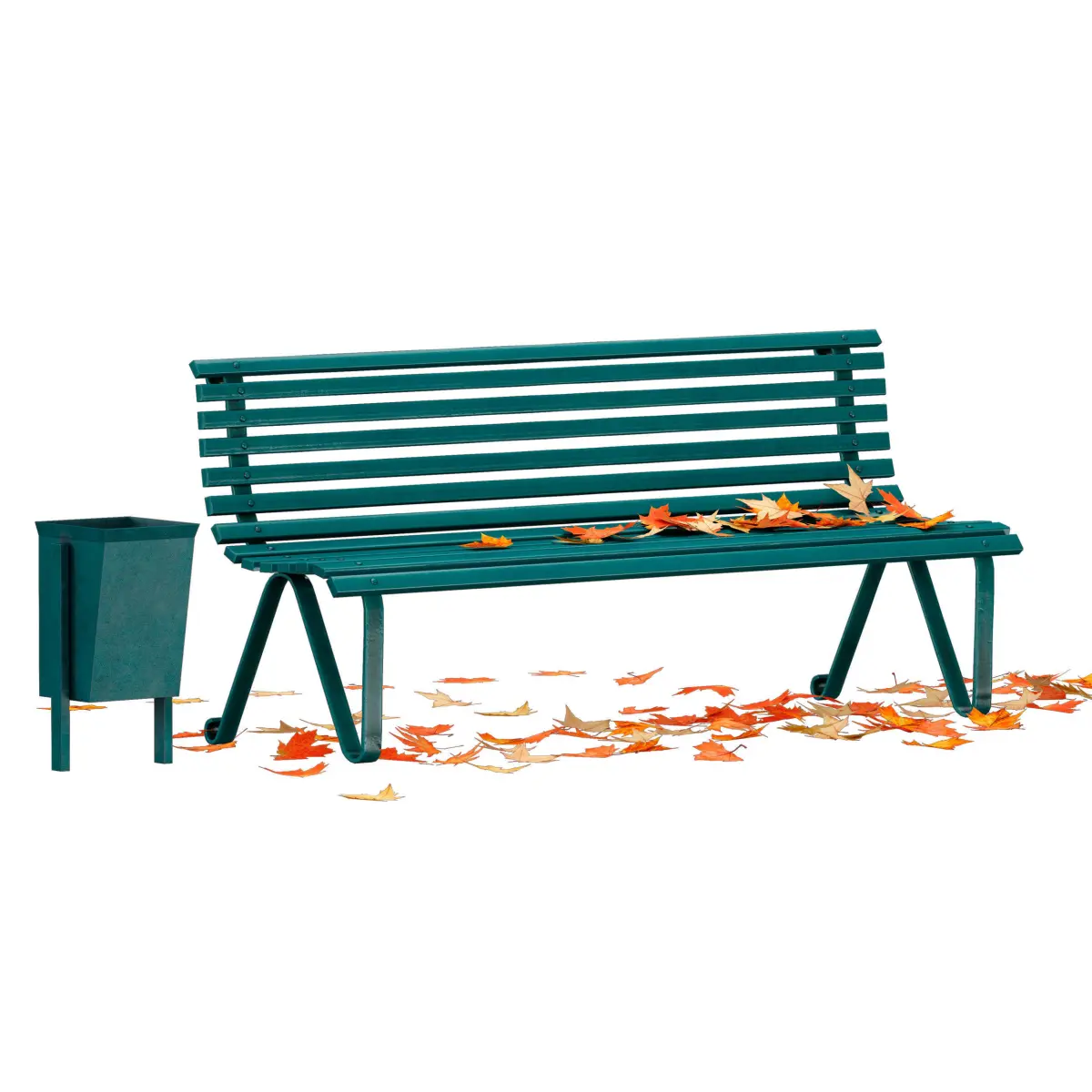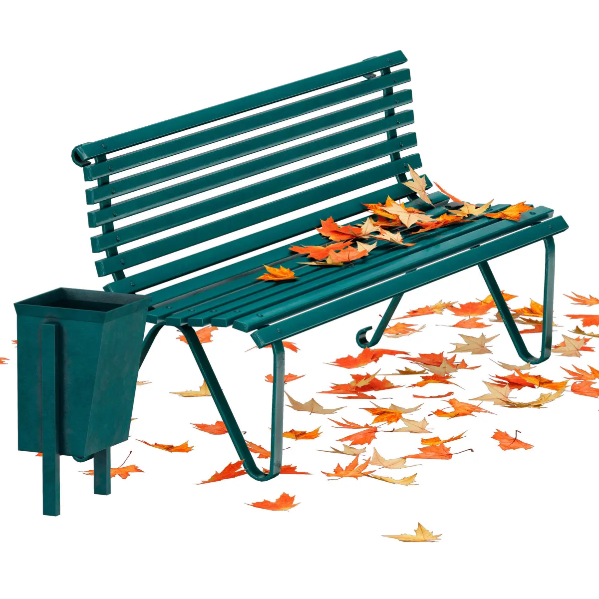 The composition of the model includes the following elements: a park bench, a bench, a metal urn, a pile of maple autumn leaves. The bench is made in a classic style - curved metal legs with wooden slats in the form of crossbars. The bench is painted in a dark green color, a cold shade.