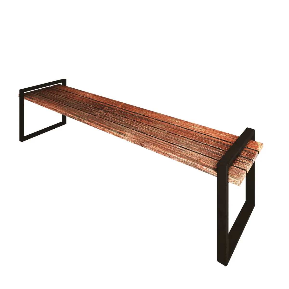 Materials are dark used wood, and the structure is black steel.