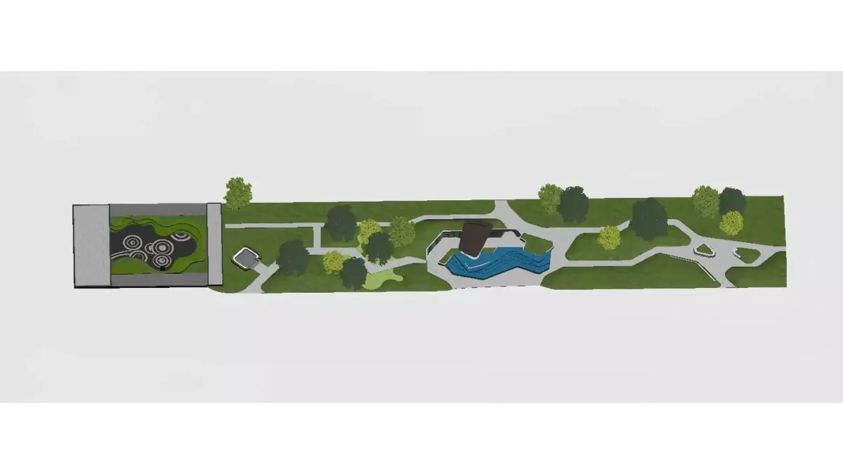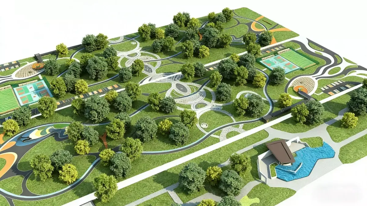 This is a rendering of landscape planning for a modern park. With a large area of green space as the foundation, it is matched with multi-layered vegetation and a winding greenway system, connecting functional zones such as sports fields (including football pitches and basketball courts), leisure plazas and small water features. Meanwhile, it integrates pavements and facilities featuring a modern design style. It not only meets the needs of ecological leisure, but also takes into account outdoor scenarios such as sports and socializing, making it a scheme of urban public space that combines aesthetic appeal with practicality.