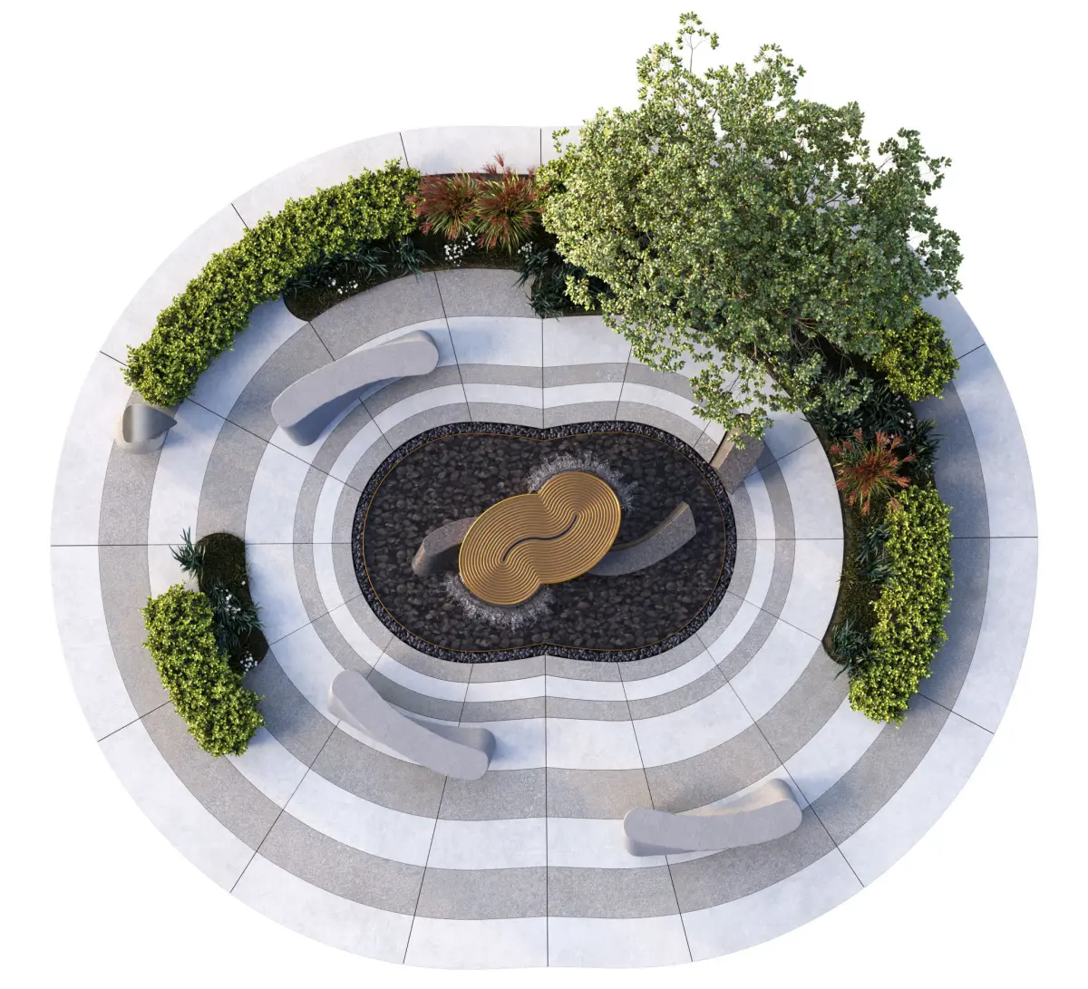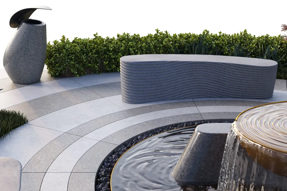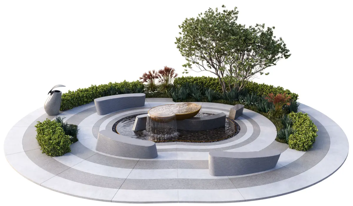 Park Square with Metallic Sculpture and Waterfalls Suitable for gardens, parks, squares,and other architectural projects