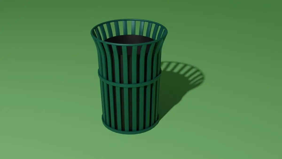 A metal outdoors trash can. It has a round shape.The model is made in Blender 3.0 and rendered in Cycles.
