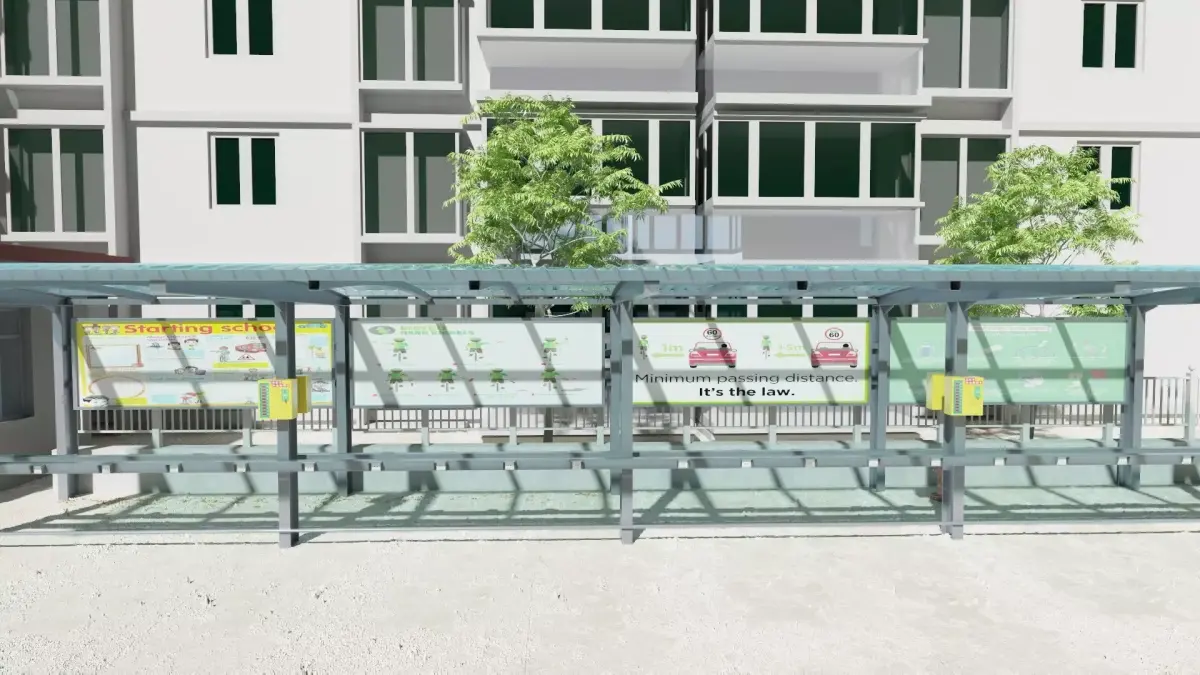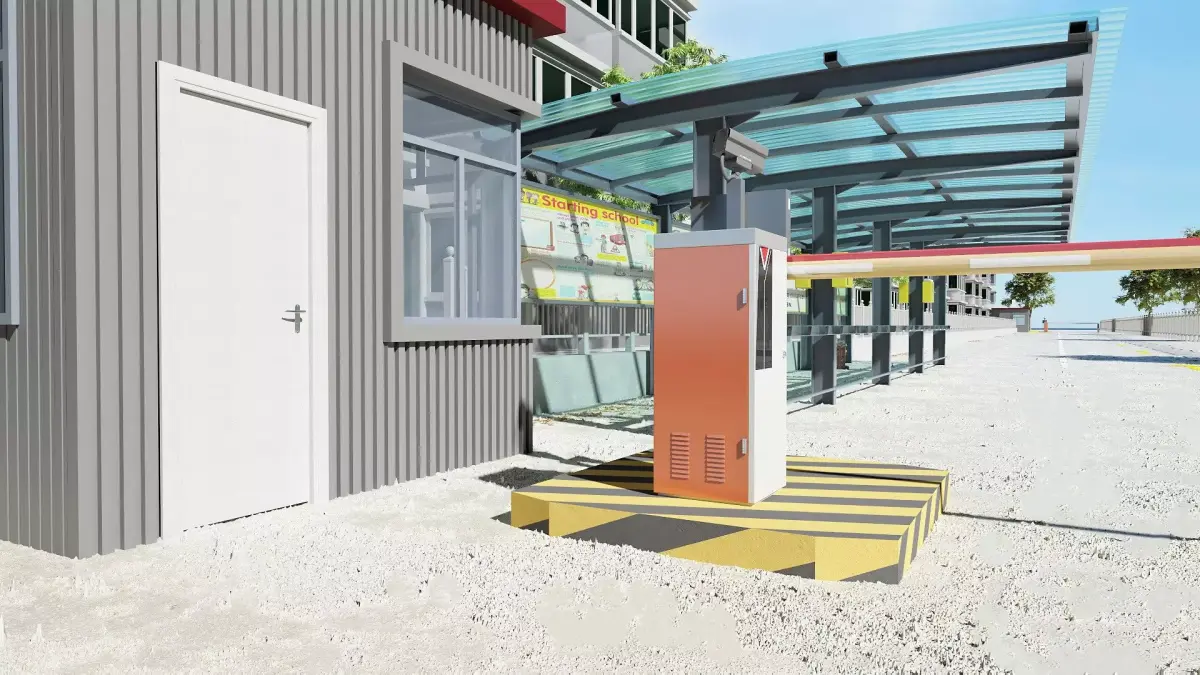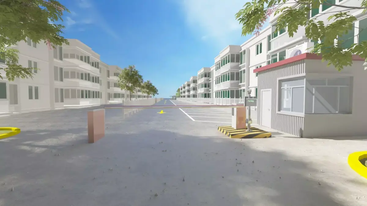 Parking concept for bikes, motobikes and cars. Security staff room, surveillance camera, tree, fence, 2 apartment buildings, various decorations.