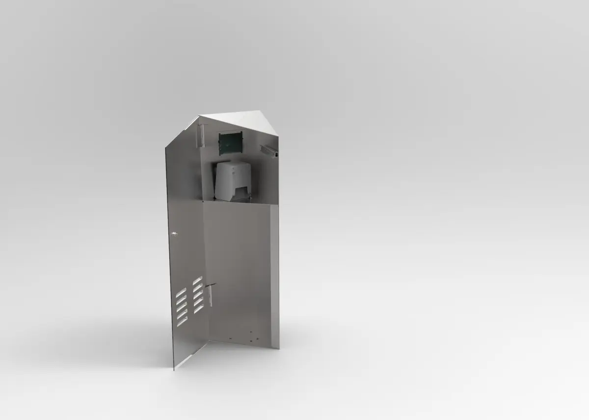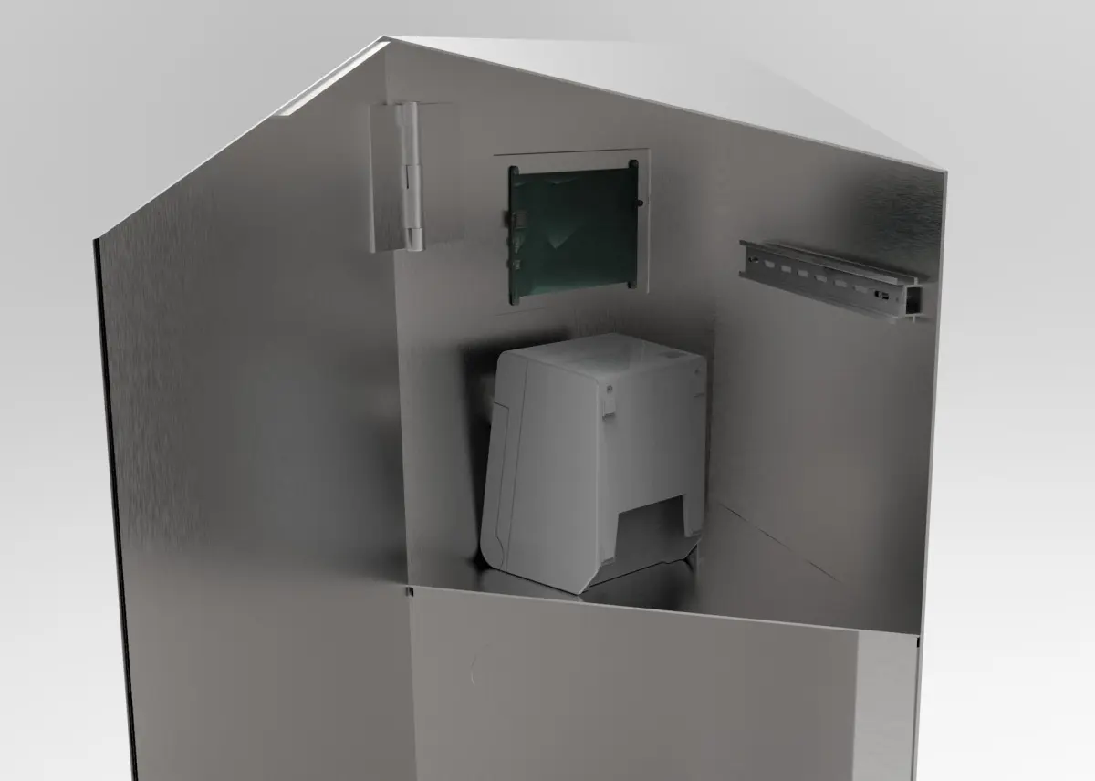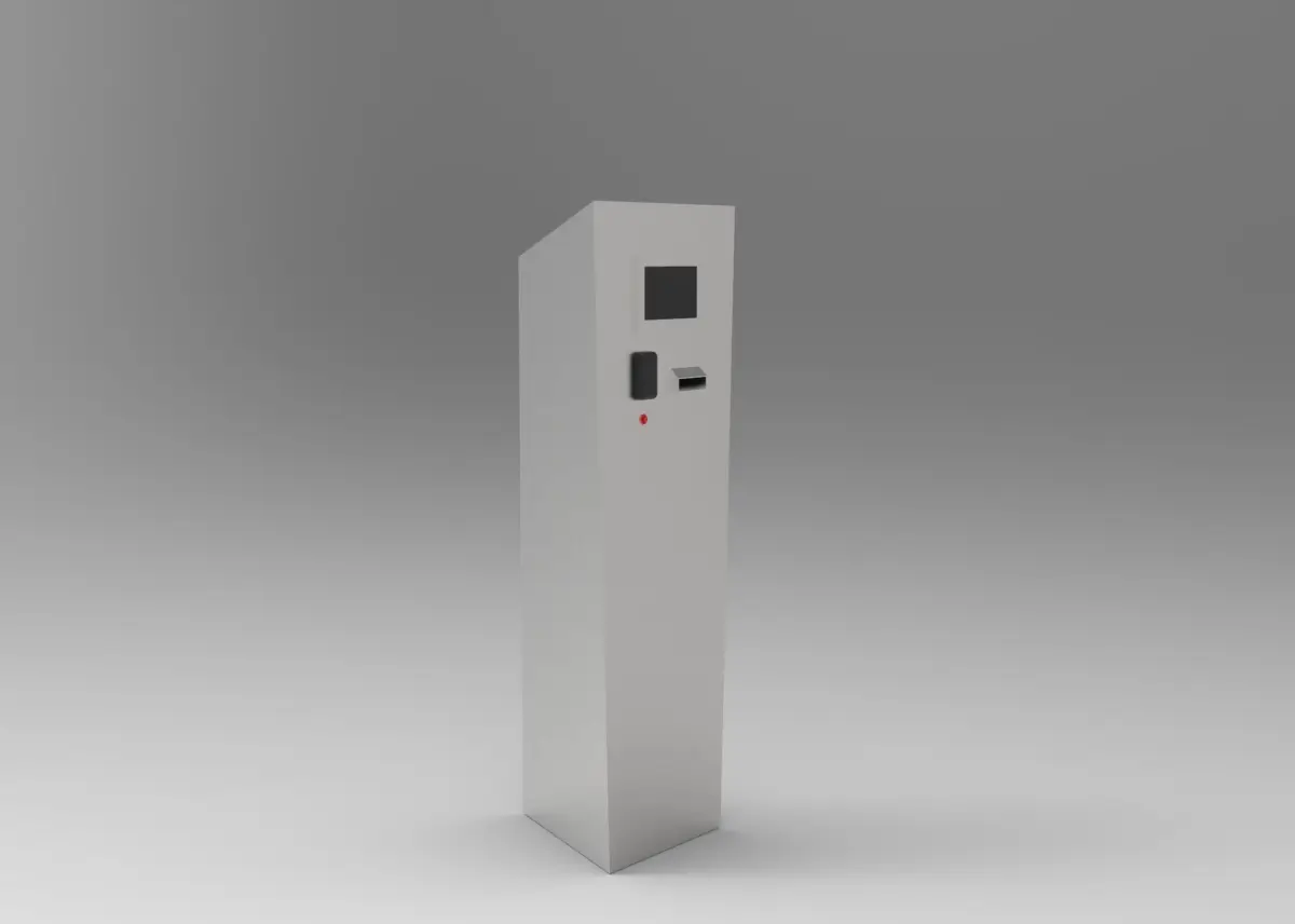 Parking ticket machine made with stainless steel. It has a 7" touch screen, an Epison ticket printer, a button and a termic reel for the connections. It comes with a key-lock to open the door and holes in the bottom to embed to the ground.