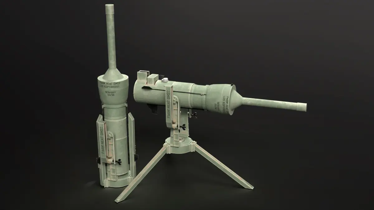 PARM-2 / DM-22 is a German off-route mine that fires small fin stabilized rocket. The PARM 2 incorporates an infra-red sensor, the SAPIR, which acts to accurately fire the rocket to ranges up to 100 metres (330 ft). The warhead of the PARM 2 has been upgraded, with armour penetration of 750 millimetres (30 in) and a capability against reactive armour. It can be programmed to be active for between several hours and 30 days.Modeled and textured by Olexander Savchenko. Made in 2023