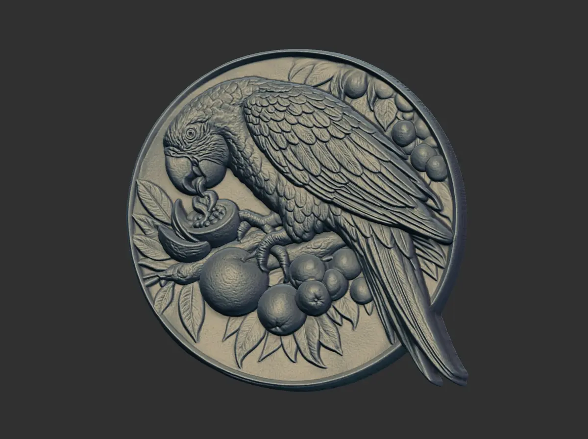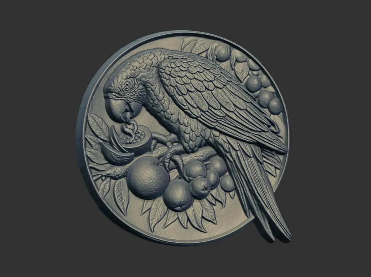 This image depicts a 3D bas-relief of a parrot, likely intended for 3D printing or CNC machining. It shows a detailed parrot perched on a branch, eating fruit, all within a circular frame. The design is intricate, highlighting the parrot's feathers and the textures of the fruit and leaves. The model appears to be designed for creating decorative items such as wall art, medallions or pendants. The image is a digital rendering, showcasing the potential of the 3D model.