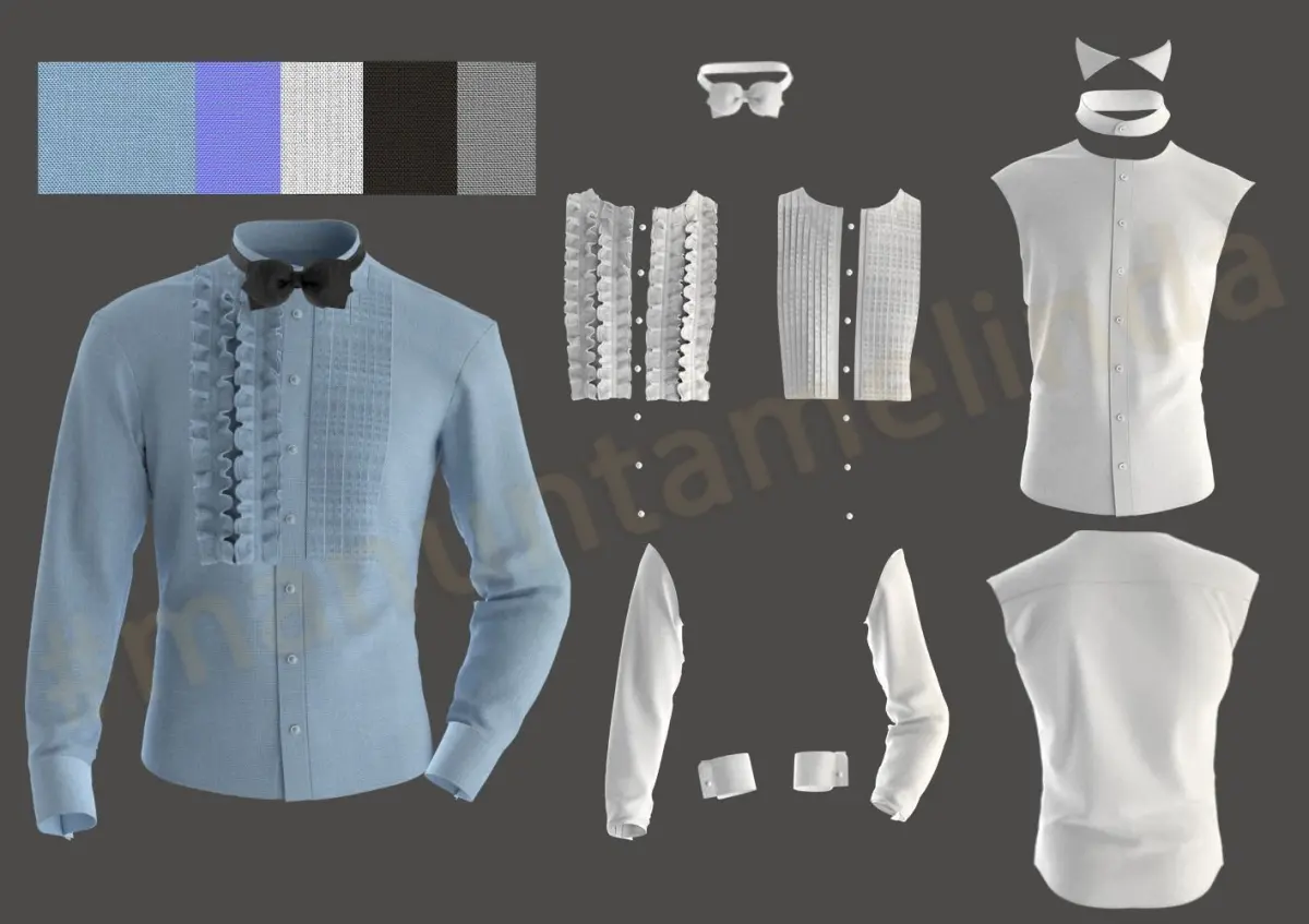 3D Tuxedo shirt mini puzzle configuratorMy name is Manunta Melinda, I am a 3D fashion designer. I prepared the tuxedo shirt for men in fashion poses for you. With 9 perfectly matched pieces, ready to use. Useful for the online t-shirt configurator. Easy to use for displaying products for wepshop.The models contain top stitches, buttons for UV maps and 4K materials.