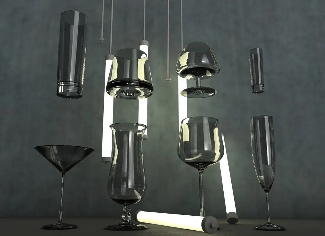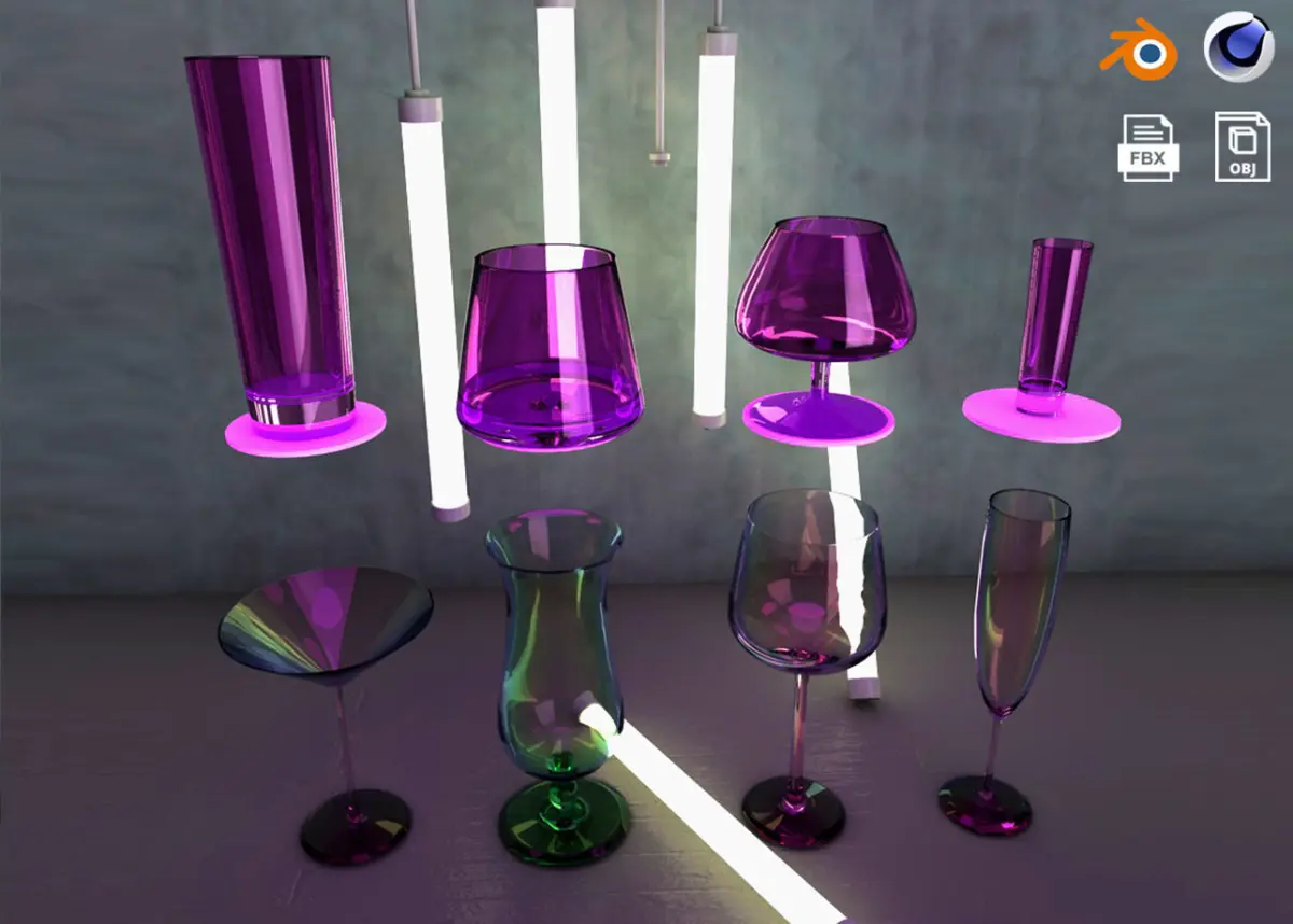 Perfect Alcohol Glass Set flute cocktail glasses 3D barware visualisation collection is a unique piece for create cool modern BAR scenes and for wine aesthetic lovers. !!!!!Easy to append and position into your 3d project.
