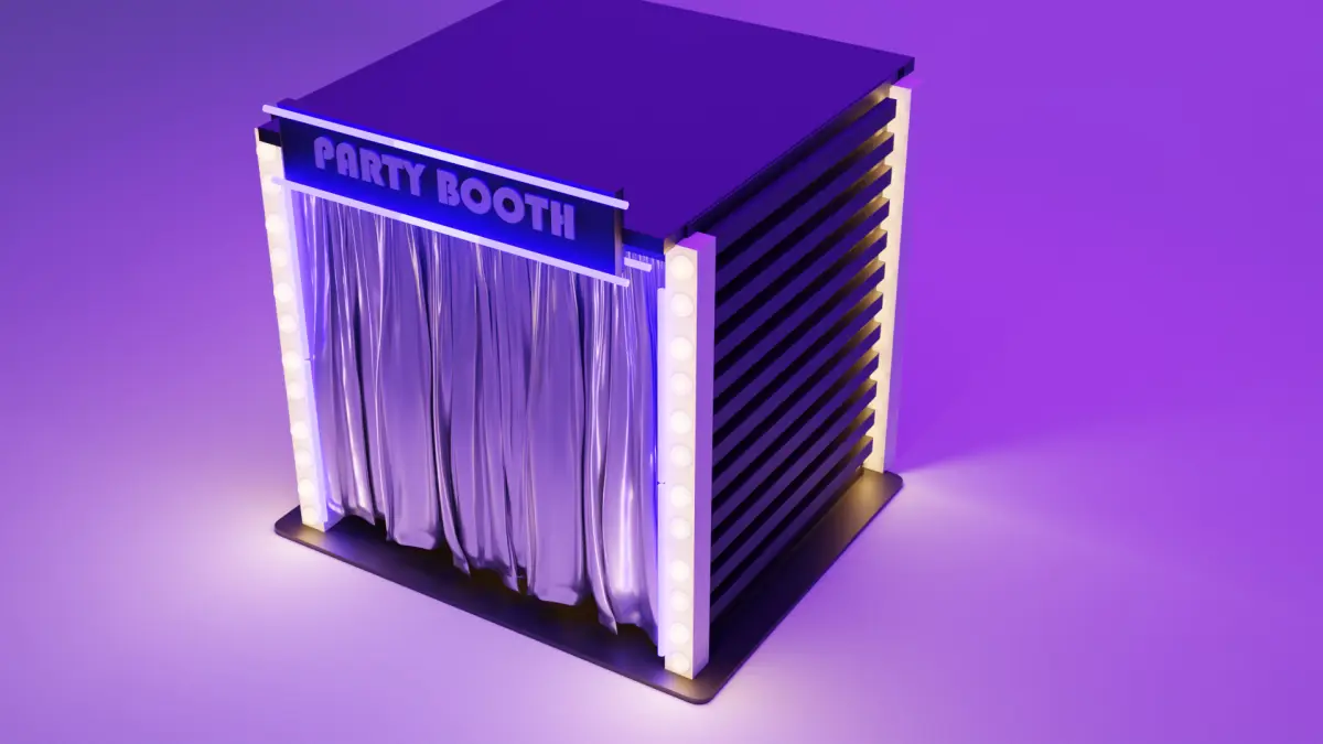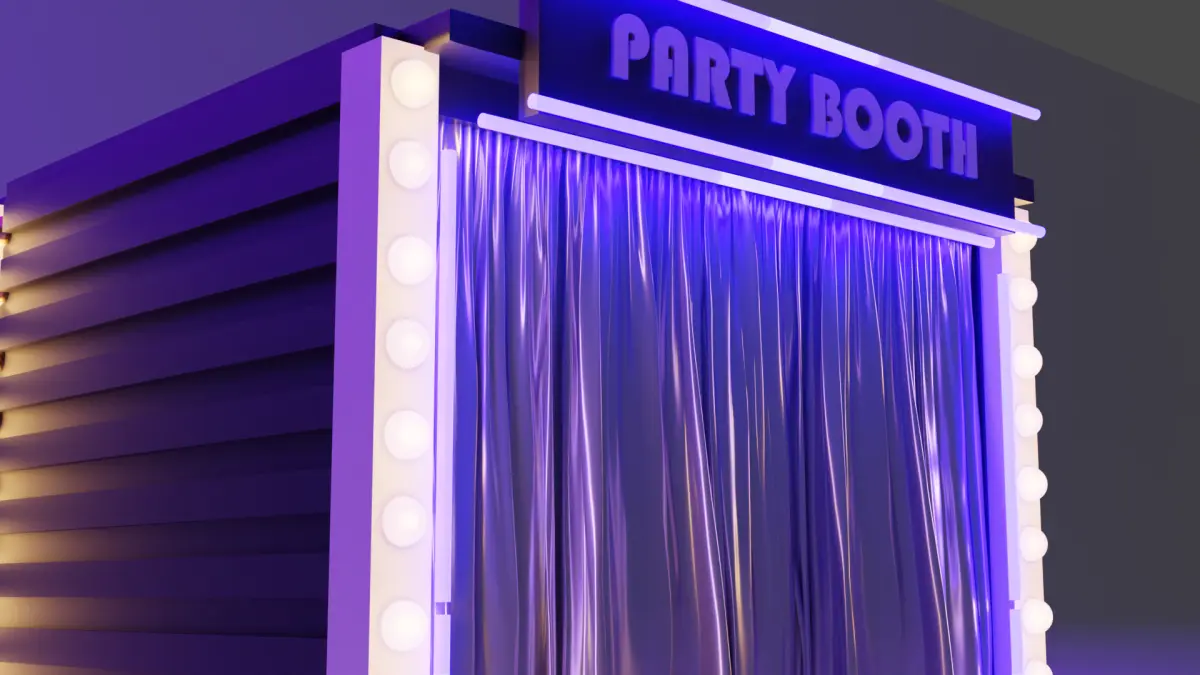 3d model for a sleek, modern photo booth with a mesmerizing neon-lit backdrop and metallic curtains that shimmer under the lights. The neon lights dance across the structure, casting a vibrant glow that invites partygoers to snap unforgettable photos. The metallic curtains add a touch of luxury and sophistication, while the modern design ensures a fresh, contemporary look that's perfect for capturing memories at any celebration. This 3D model combines style, fun, and technology to create an immersive photo booth experience that's sure to be a hit at any party.