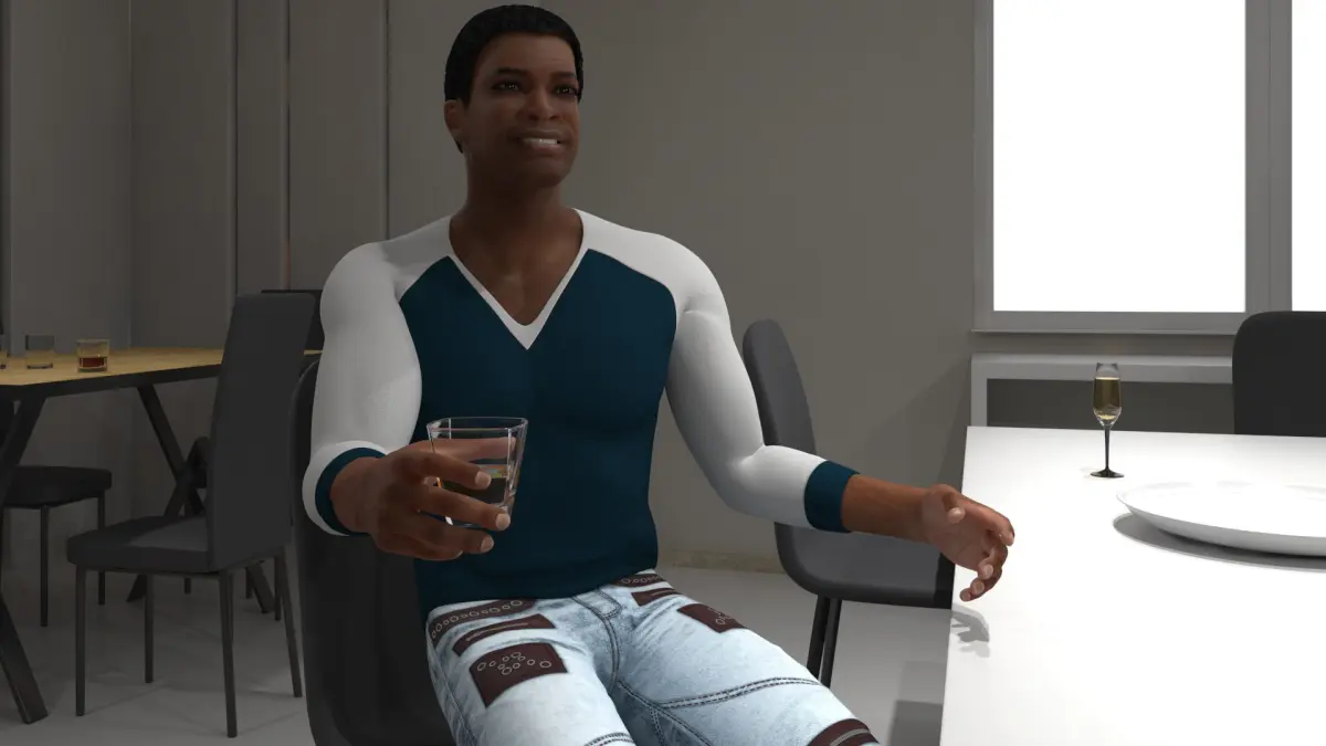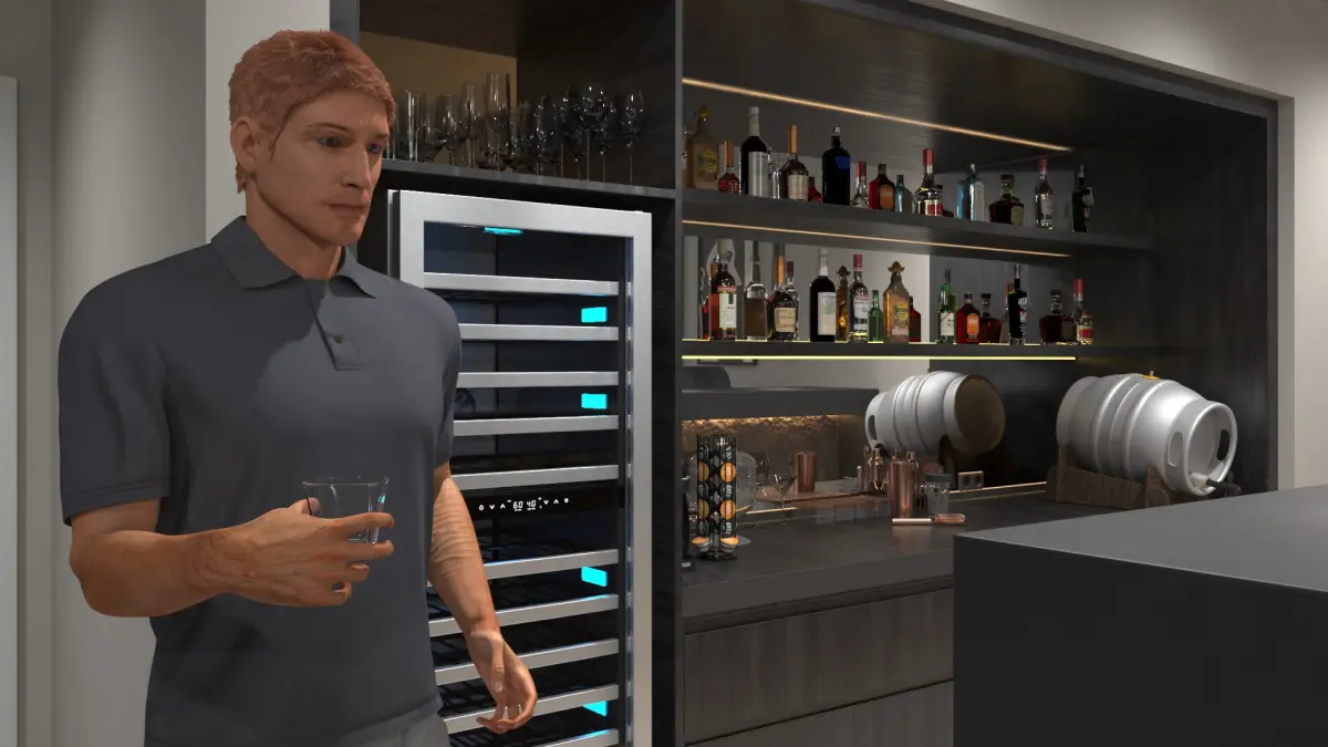 The private home bar scene is a depiction of a home bar environment where group of participants, a male and female including, interact in a relaxed setting. This scene includes a bar counter, chairs, tables and various bottles of alcohol, along with glassware. The scene captures a moment of casual interaction and leisure, ideal for settings such as home entertainment areas.