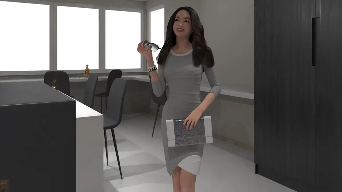 Party in Private Home Bar is a three-dimensional model of private home bar scene, that is a home bar setting featuring a male and female character engaging in a casual, social atmosphere.