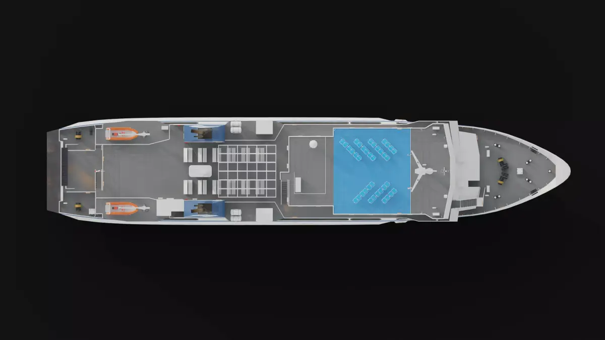 Non-overlapping: hull, deck surface, superstructure large faces and life-raft.