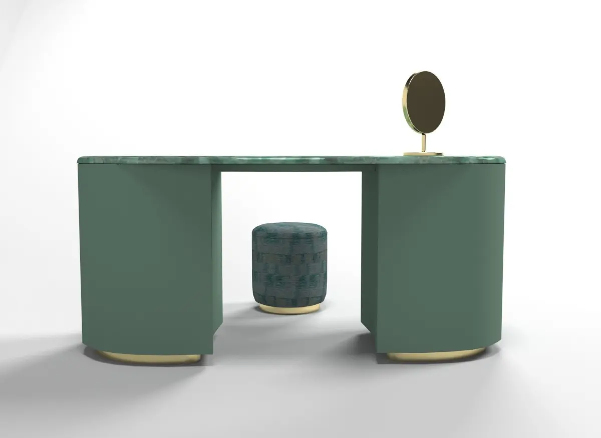 DESCRIPTIONCoiffeuse. Passion represents the latest addition to the collection of vanity tables by Armani/Casa. Born form the reinterpretation of the iconic Giunone desk, this coiffeuse is marked by sinous lines perfectly matching the delicate hues of green of the materials: the leather-clad structure is completed by a top in natural quartzite and detail in satin-finished brass. The coiffeuse features 8 drawers with matt black interiors in wood, which can be used to store jewelry, perfumes and make-up, but also stationery and writing instruments. The Passion range is completed by a stool and an optional mirror (featuring a LED system to light its frame), that can be bought separately.MADE IN ITALY