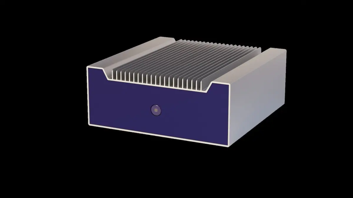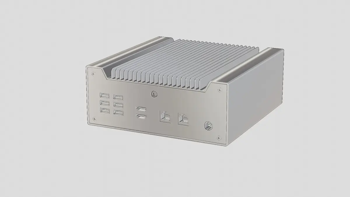 3D model of a robust industrial computer, to be used as an edge device in factories as part of a Computer Vision system, Automated quality inspection system, barcode scanning, etc. Devices like this are commonly used to run on-site AI algorithms in modern factories. The device is passively cooled to assure a high level of proofing against a typical production room environment. An aluminum case with fins helps to disperse heat more efficiently. It is equipped with USB 3.0, HDMI, ethernet, DC input, and a Wi-Fi antenna port.