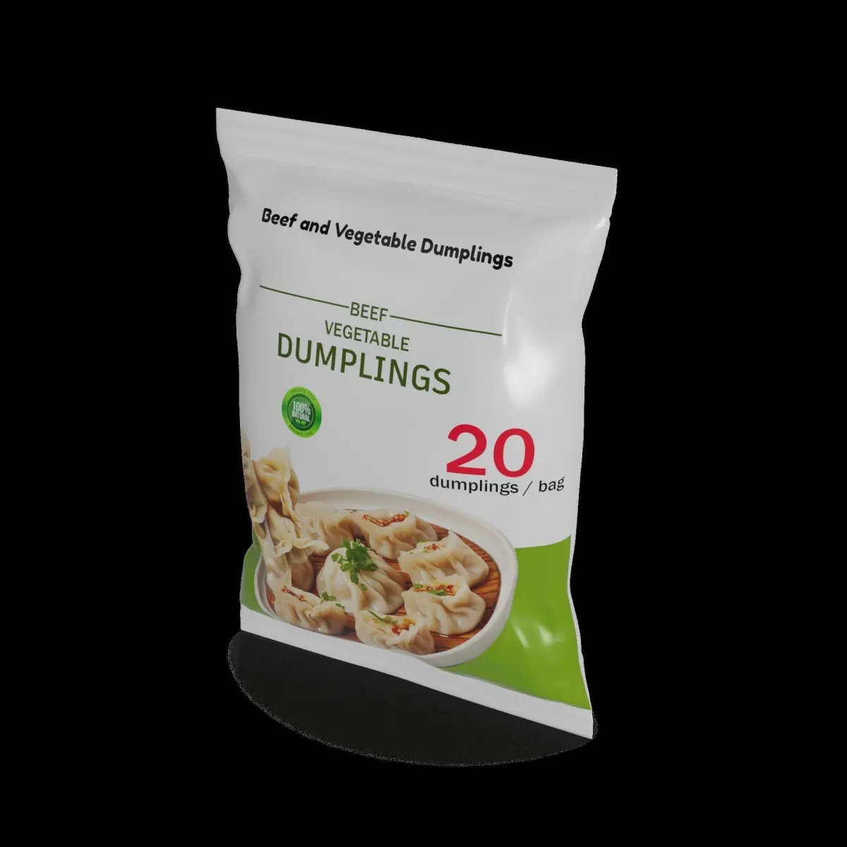 Beef and Vegetable Dumplings: Experience the authentic flavors of our Beef and Vegetable Dumplings. These bite-sized delights are filled with a delicious mixture of seasoned beef, fresh vegetables, and aromatic spices. Packaged in a vibrant green bag, our dumplings are sure to stand out on the store shelf. The bag features a mouthwatering image of the dumplings, along with the words Beef and Vegetable Dumplings in bold, eye-catching font. Each bag contains 20 dumplings, perfect for a quick and satisfying meal.