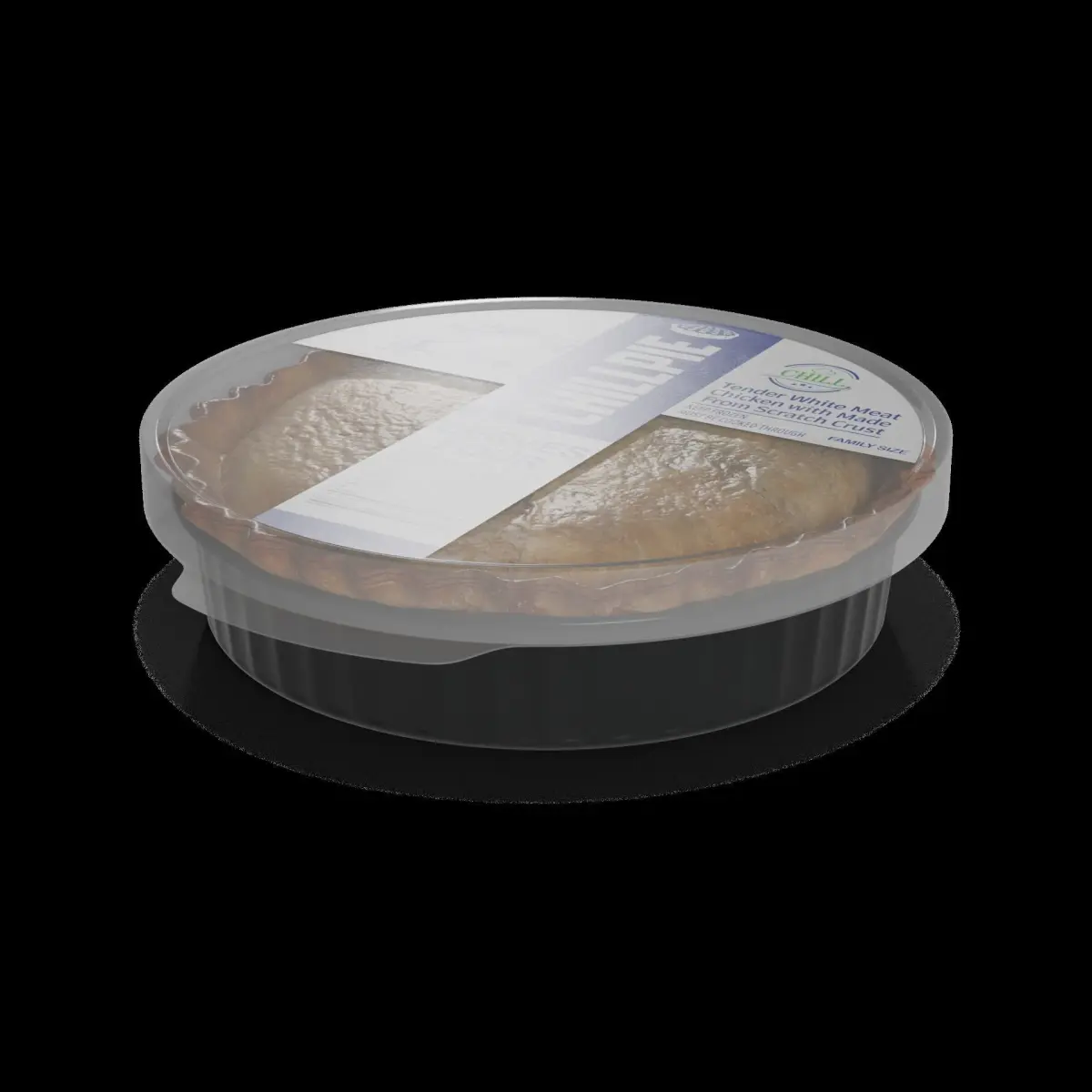 Chicken and Leek Pie: Indulge in the comforting flavors of our Chicken and Leek Pie. This delicious pie features tender pieces of chicken and saut��ed leeks, all enveloped in a buttery pastry crust. Packaged in a microwave-safe container, the pie is covered with a transparent film that allows you to see the mouthwatering filling inside. The container includes a label with the words Chicken and Leek Pie in bold letters, accompanied by an appetizing image of the pie. With a serving size of one, this pie is a convenient and satisfying meal option.
