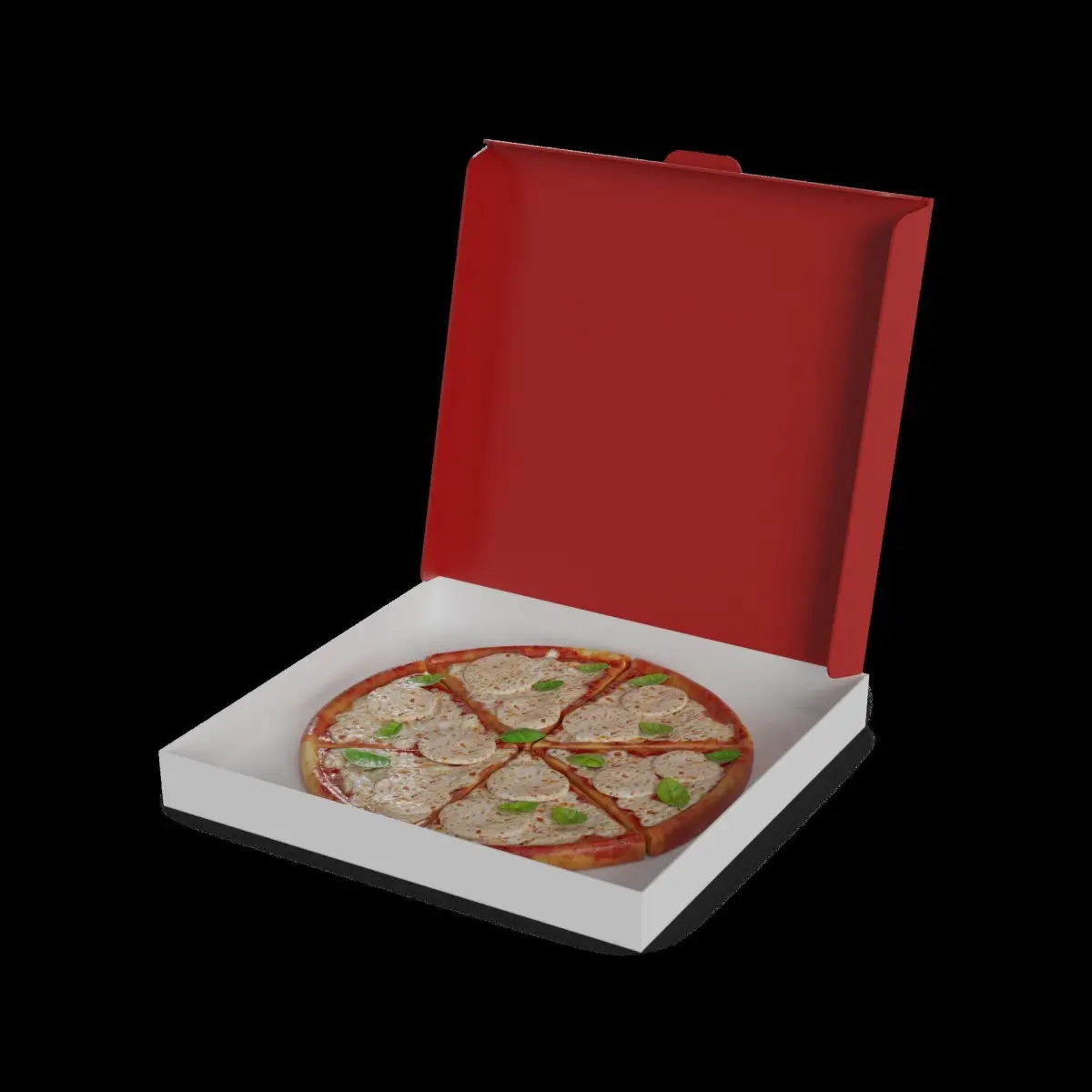 Margherita Pizza: Enjoy a classic Margherita Pizza that is simple yet bursting with flavor. This traditional pizza is topped with a rich tomato sauce, creamy mozzarella cheese, and fresh basil leaves. The pizza comes in a round, cardboard box with a clean and minimalist design, featuring a mouthwatering image of the pizza on the front. The box is easy to open and close, ensuring the freshness of the pizza. Inside, you'll find the pizza resting on a round, golden crust, with the toppings evenly distributed. The vibrant red of the tomato sauce contrasts beautifully with the white of the melted cheese, creating an appetizing visual appeal. As you take a bite, the tangy tomato sauce blends harmoniously with the creamy cheese, while the fragrant basil adds a refreshing touch. The crust is crispy on the outside and soft on the inside, providing the perfect base for the toppings. Whether you're enjoying it as a quick lunch or a late-night snack, this Margherita Pizza is a timeless favorite.