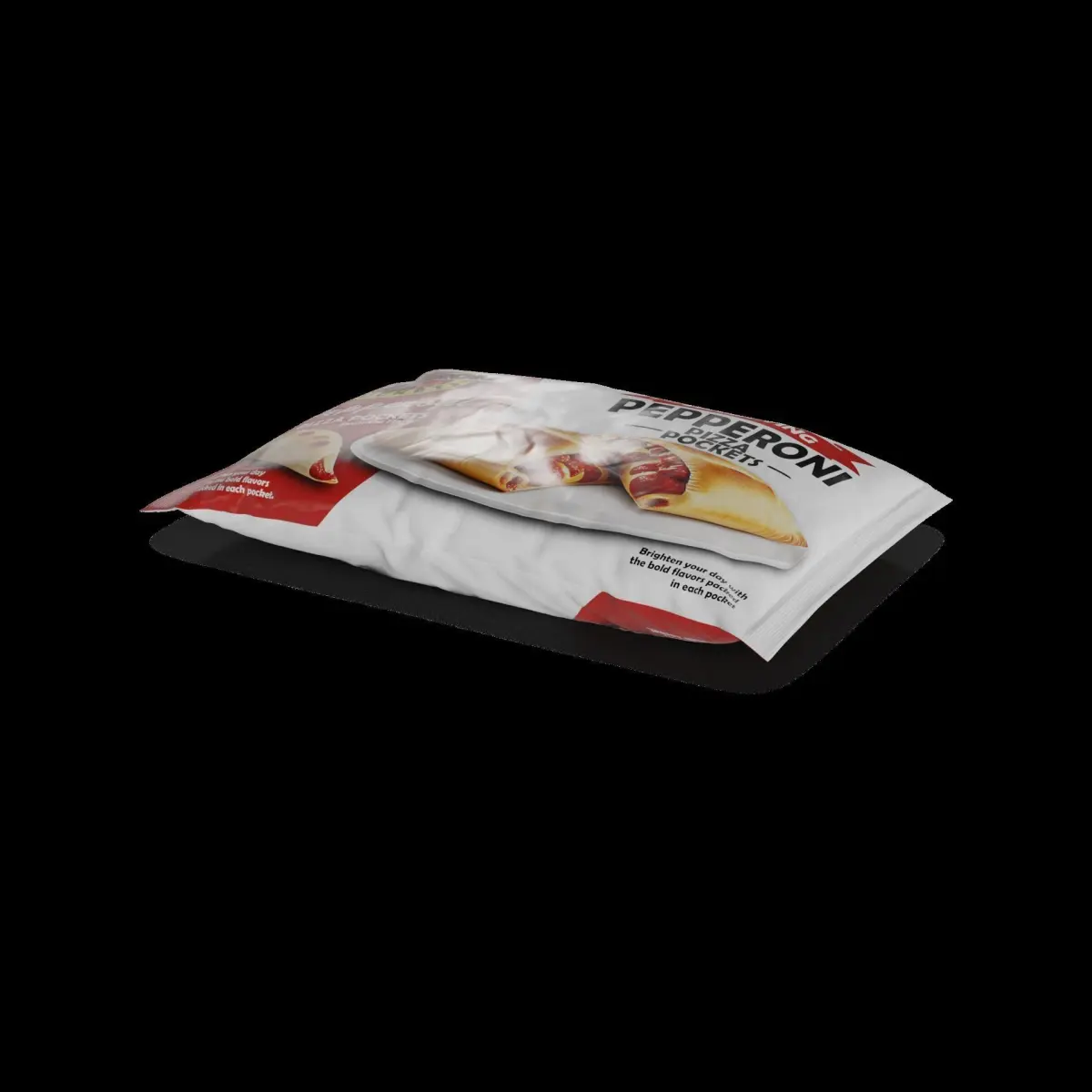 Pepperoni Pizza Pockets: Enjoy a quick and delicious meal with these convenient pepperoni pizza pockets. Each pocket is filled with a zesty tomato sauce, gooey mozzarella cheese, and spicy pepperoni, all enclosed in a soft and fluffy dough. Packaged in a bright yellow bag, the pizza pockets are easy to grab on the go. The bag features a label with a picture of the pockets and a bold text stating Pepperoni Pizza Pockets.