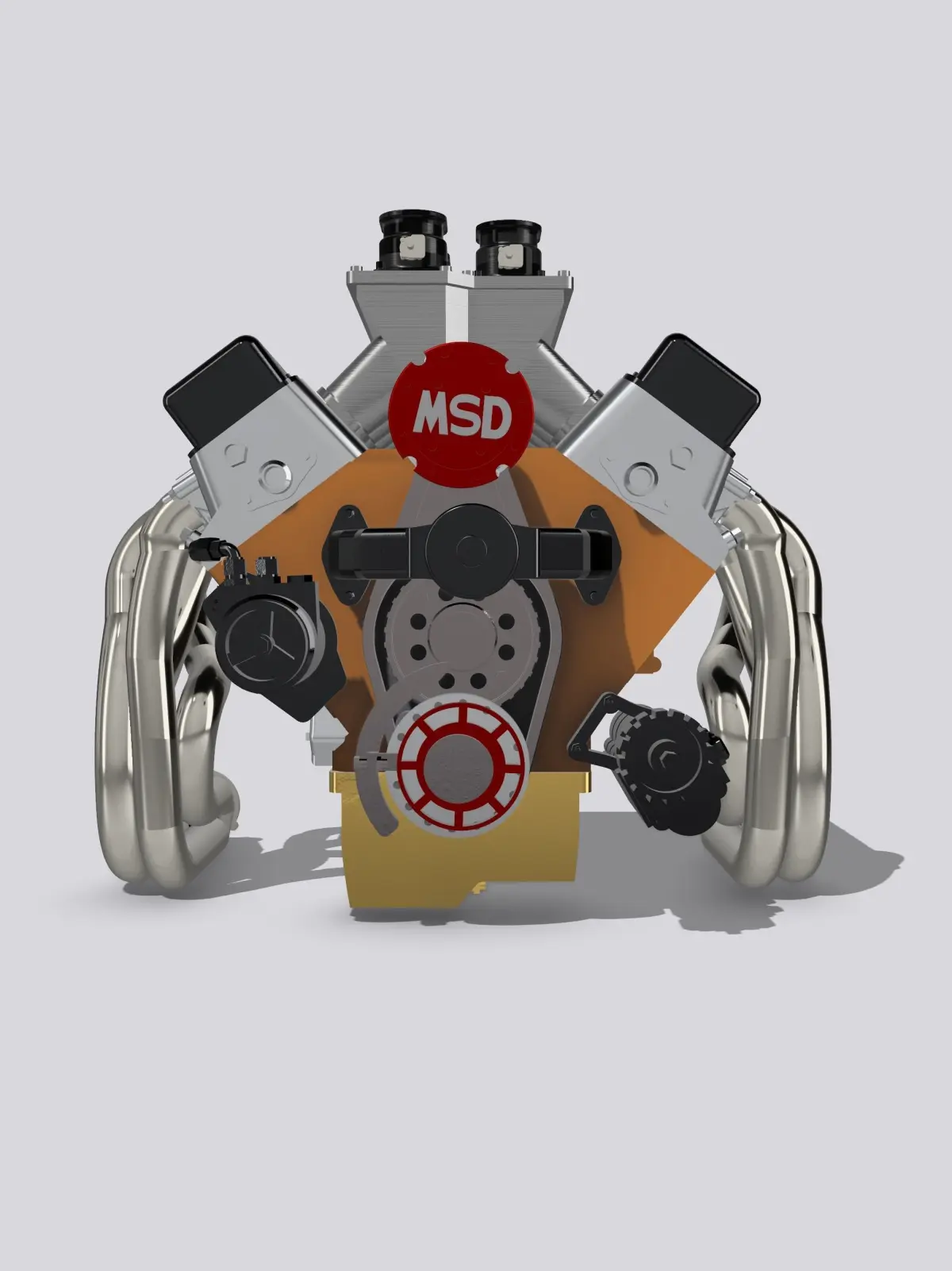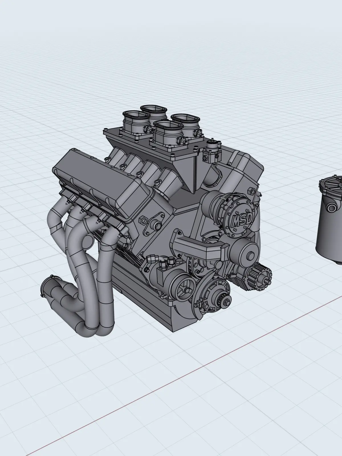Designed as a multi-piece engine for better detailing, details include Pat Musi style throttle bodies, sheet metal intake with nitrous bungs in runners, equal length headers (angled out to allow chassis rail clearance), Jesel front drive, Evac pump, MSD belt driven distributor, dry sump oil system, holes for hoses & ignition wires, and bolt/fastener details. Design can be adjusted on request.