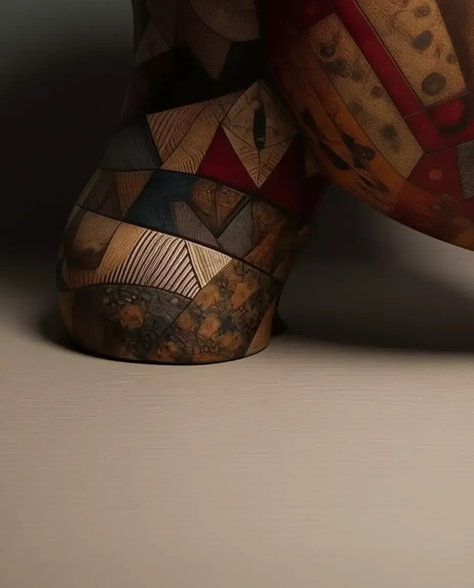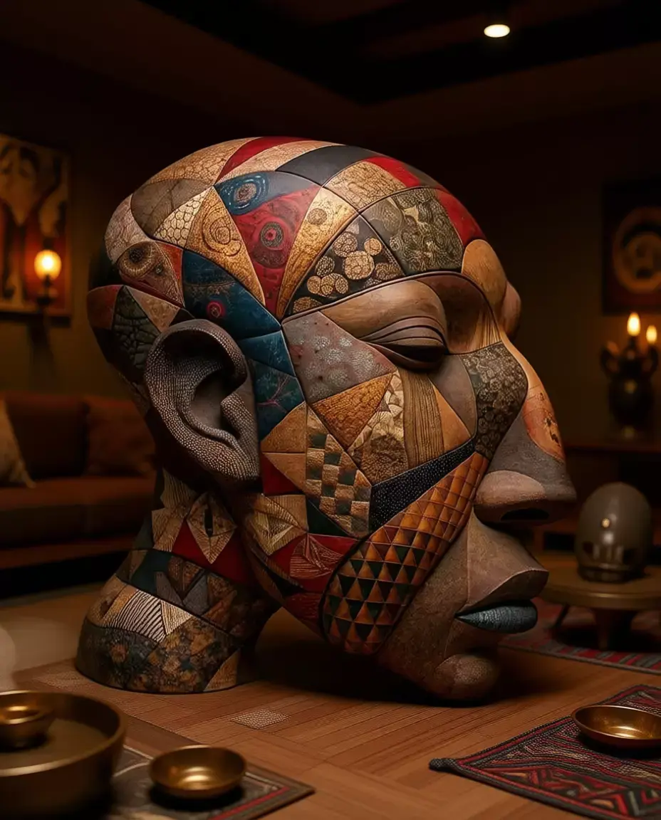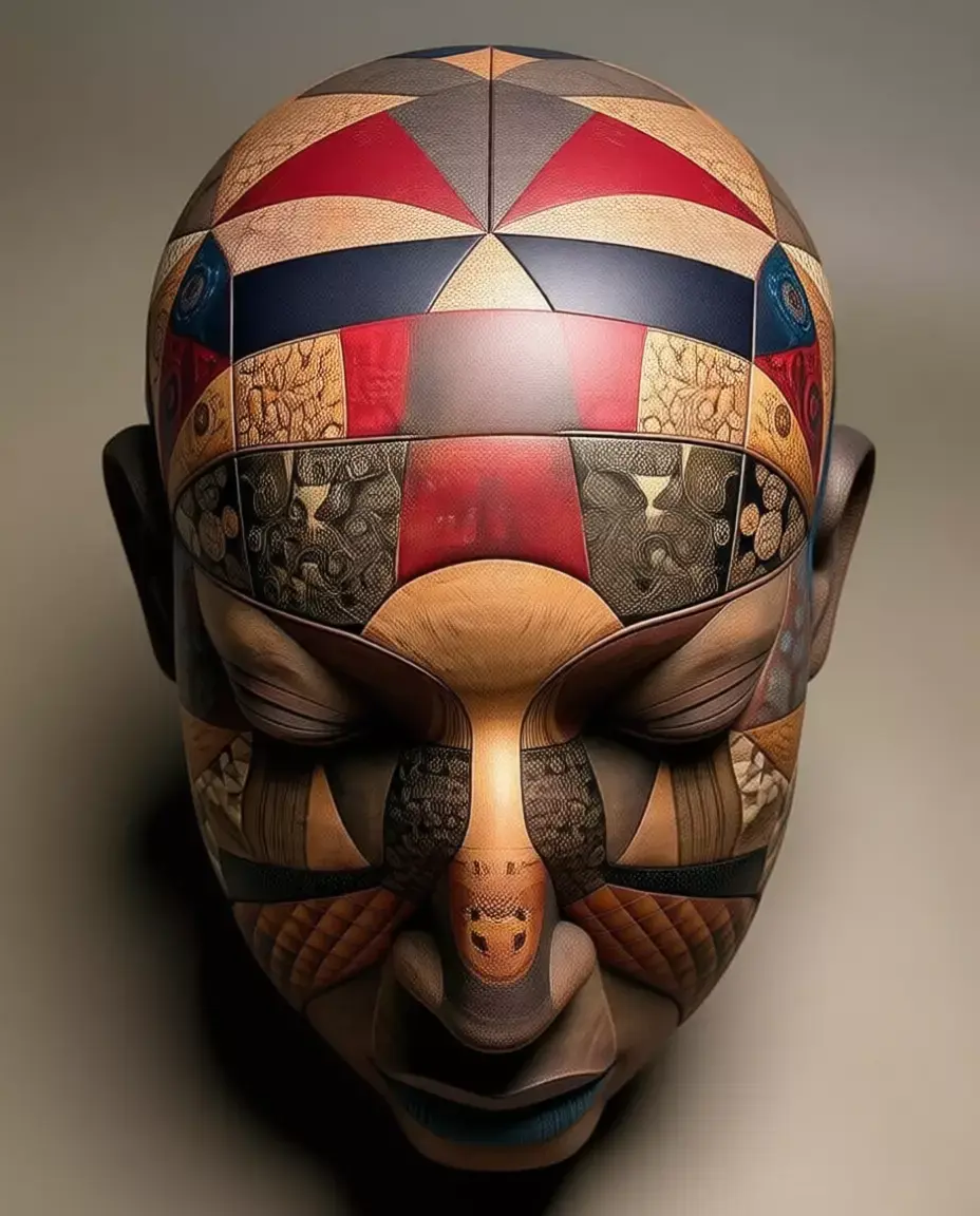Ultra-realistic 3D model of a patchwork wooden head, designed as a breathtaking fusion of geometric art and natural craftsmanship. The sculpture is composed of hundreds of intricately carved wooden pieces—each with unique textures, patterns, and colors—that are assembled into a cohesive, mosaic-like portrait. The surface features a rich tapestry of designs: swirling motifs, checkered grids, concentric circles, and abstract symbols, all rendered in warm earth tones of brown, red, blue, and gold.