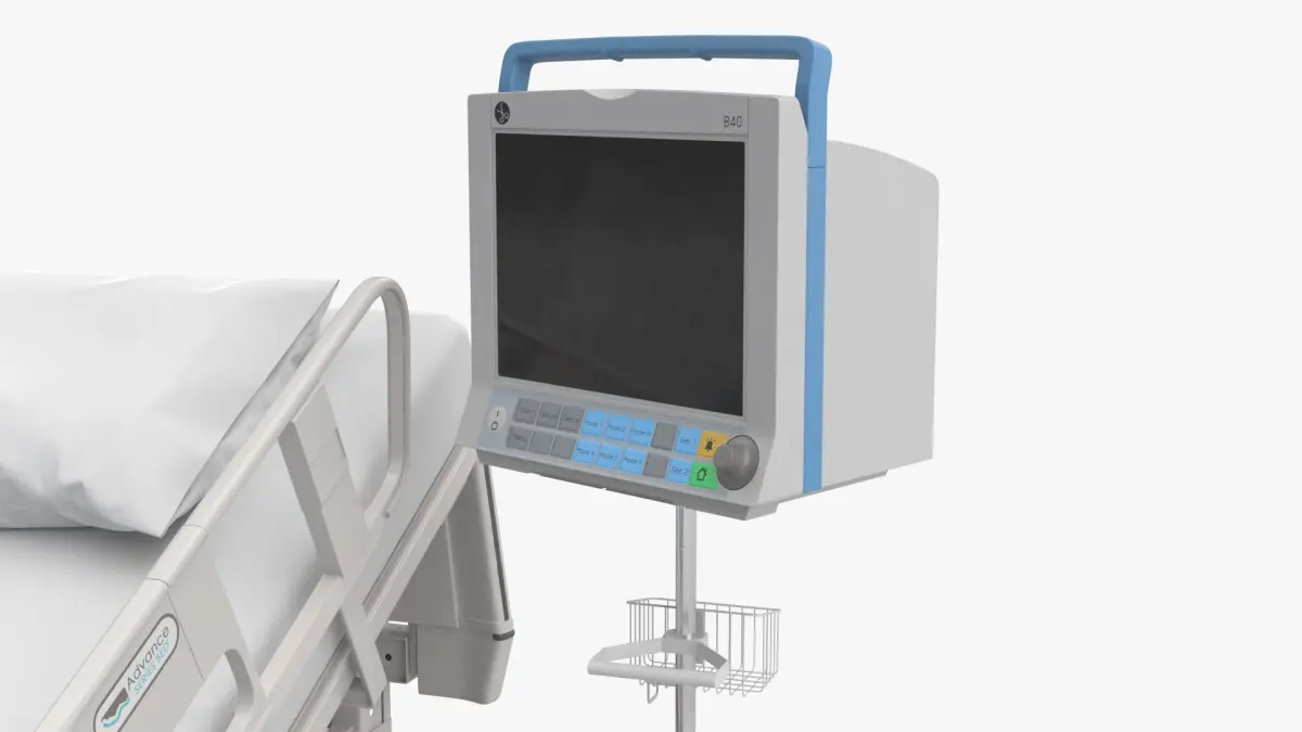 Patient Monitor with Hospital Bed and Infusion Pole is a three-dimensional model of hospital bed with IV and monitor (modern medical bed setup).