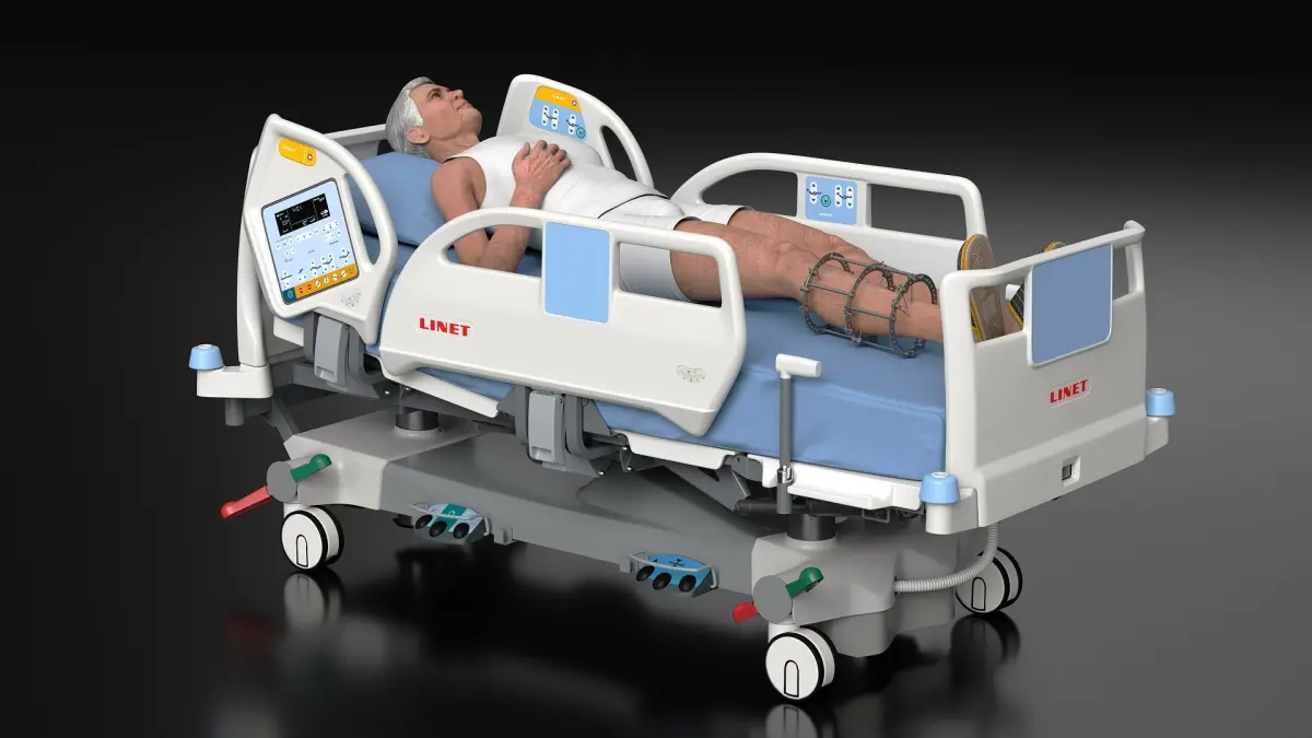 Patient with Ilizarov Apparatus on Bed is a three-dimensional model of orthopedic patient setup, specifically illustrating the use of the Ilizarov external fixation device during recovery.