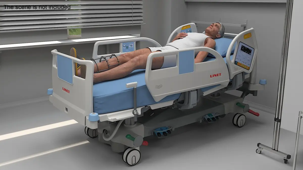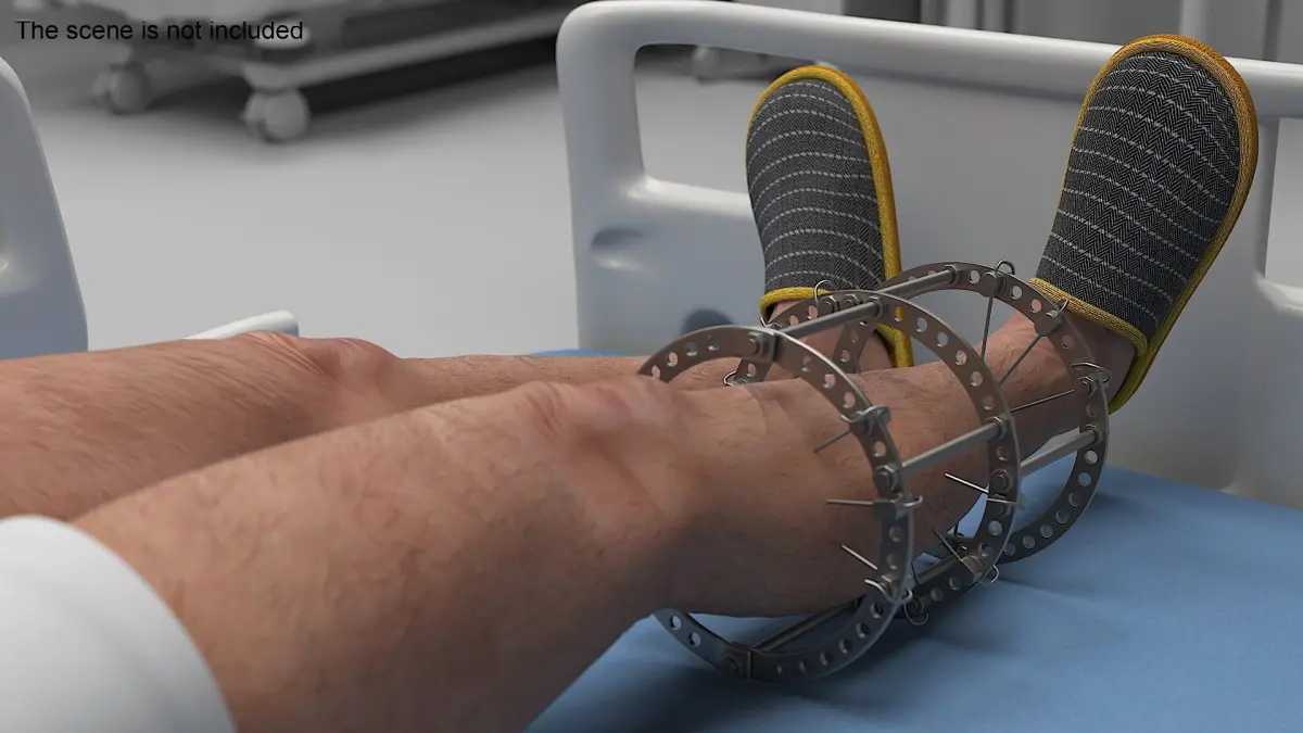 This model depicts a medical scenario where a patient lies on a hospital bed with an Ilizarov apparatus applied to the leg. The Ilizarov device, a circular external fixator, is commonly used to treat complex fractures, limb lengthening, and bone deformities. The setup realistically represents patient posture, medical positioning, and interaction with hospital bedding, offering detailed insight into long-term orthopedic care and immobilization techniques.