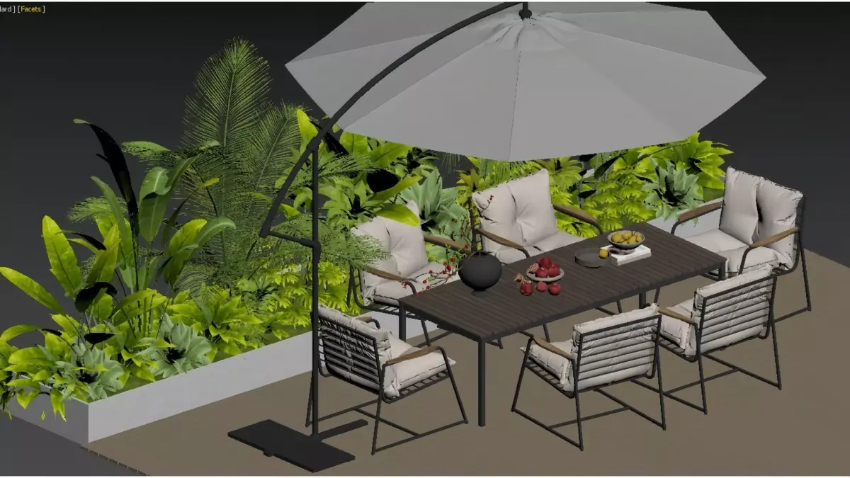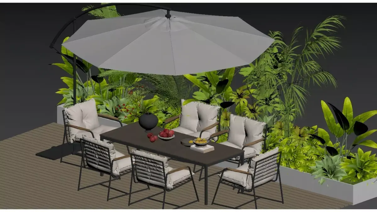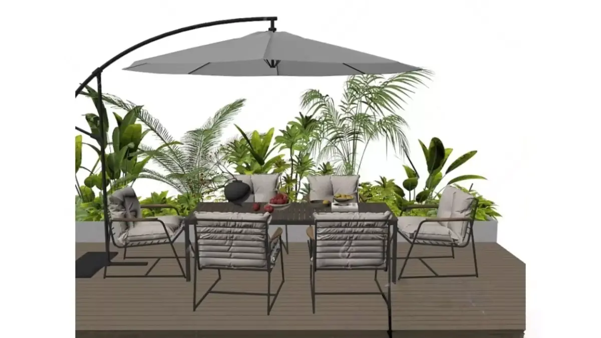 This is a modern minimalist outdoor leisure space: on the light wood-colored terrace floor, there is a set of outdoor dining tables and chairs with black frames and light-colored upholstery. It is matched with a large-sized curved sunshade, which can block the sun without obstructing the view. The surrounding area is filled with tropical green plants (such as palm leaves and broad-leaved plants) to create a fresh and natural atmosphere. Fruits and decorative utensils are placed on the table. The overall space presents a comfortable and relaxing courtyard/terrace leisure scene, suitable for afternoon tea and small family gatherings, and combines aesthetics with practicality.
