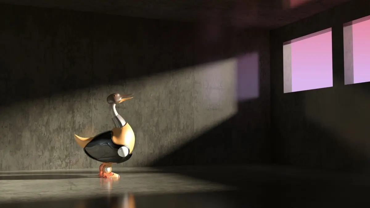 Utilitary Duck-shaped robot for companion and physical aid. This robot's unique talent for picking up fallen objects makes it suitable for disabled people, small children and older people.