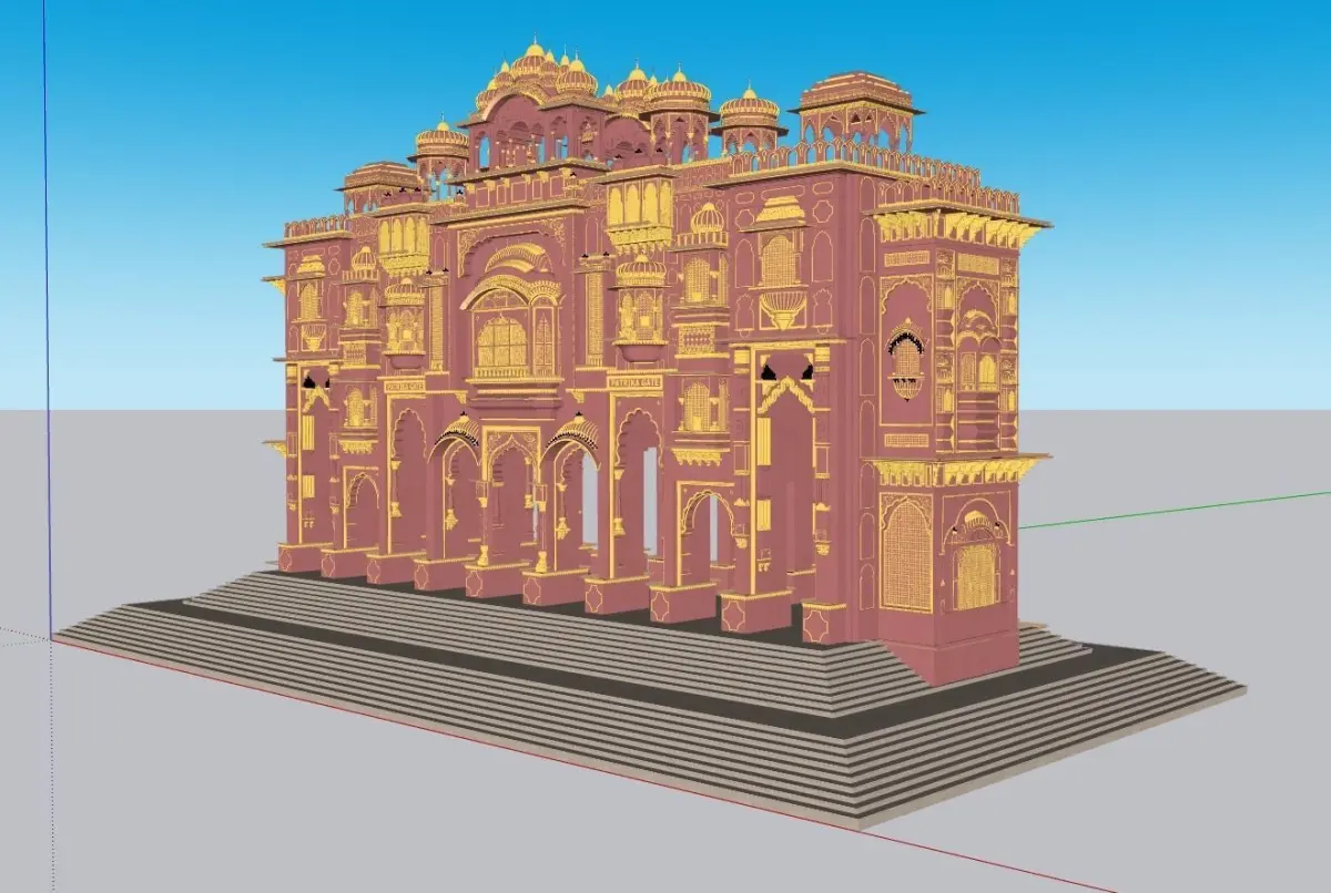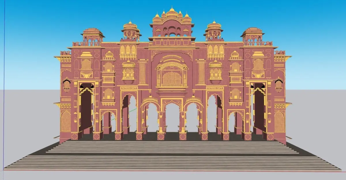 A Majestic Entrance:As you approach the Patrika Gate, be prepared to be awestruck by its grandeur. The towering structure, with its intricate carvings and vibrant hues, stands as a testament to Rajasthan's rich heritage and architectural brilliance. This 3D model brings every ornate detail to life, from the elaborate archways to the delicate floral motifs.