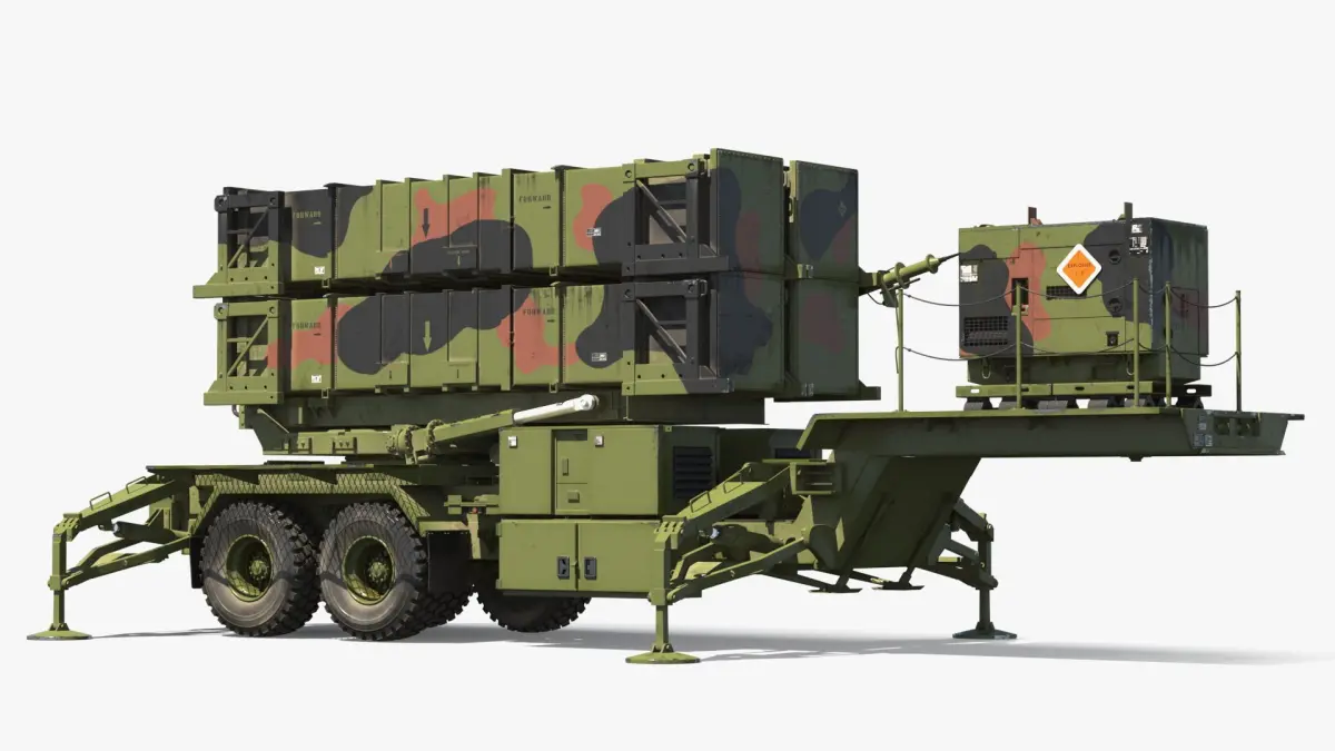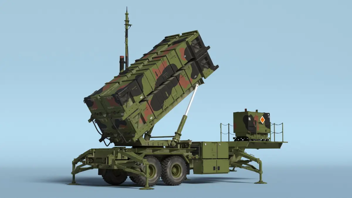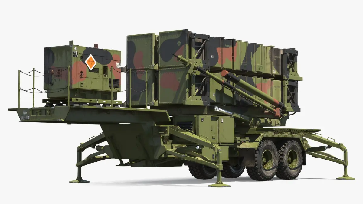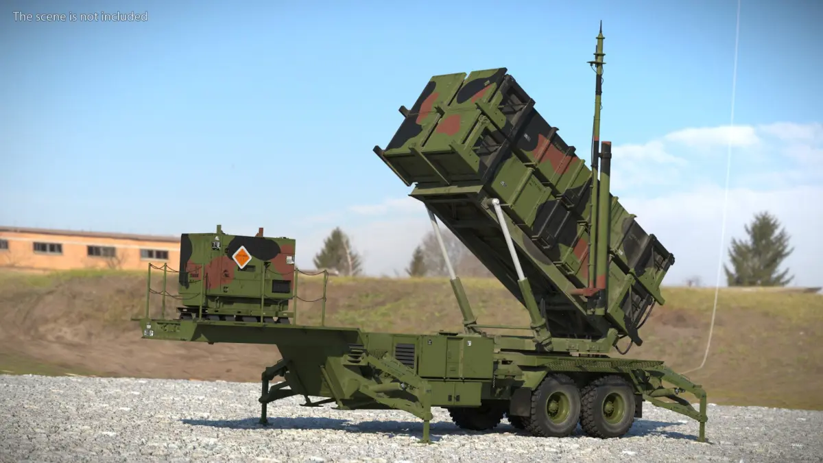 Patriot Launcher Transport Module with Support Box Camo Rigged is a 3d model of a mobile surface-to-air missile system used for defense against aerial threats.