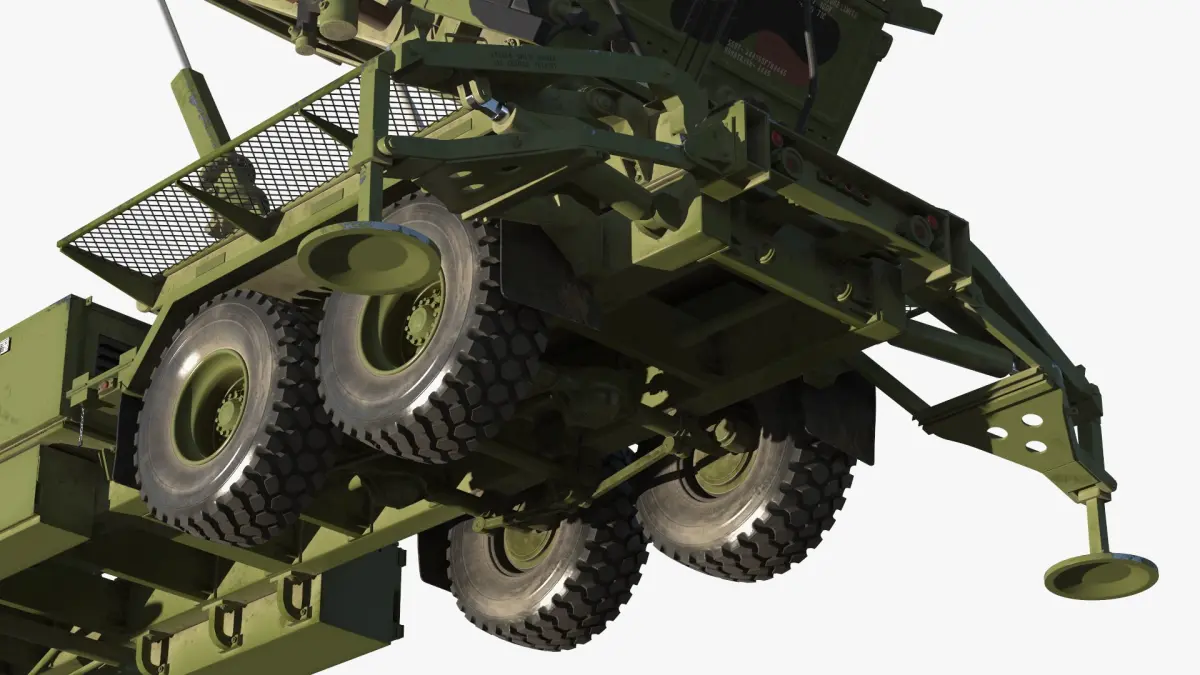 Patriot Missile Launcher on Wheeled Trailer Camo is a 3d model of a sophisticated missile defense system designed to protect against airborne threats.