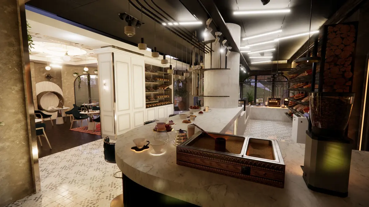 • Two bars, • Chairs• Tables• Wall and floor decoration material• Garden materials• Garden design• Interior design• Enterance design• All other elements in the rendered pictures• And textures.