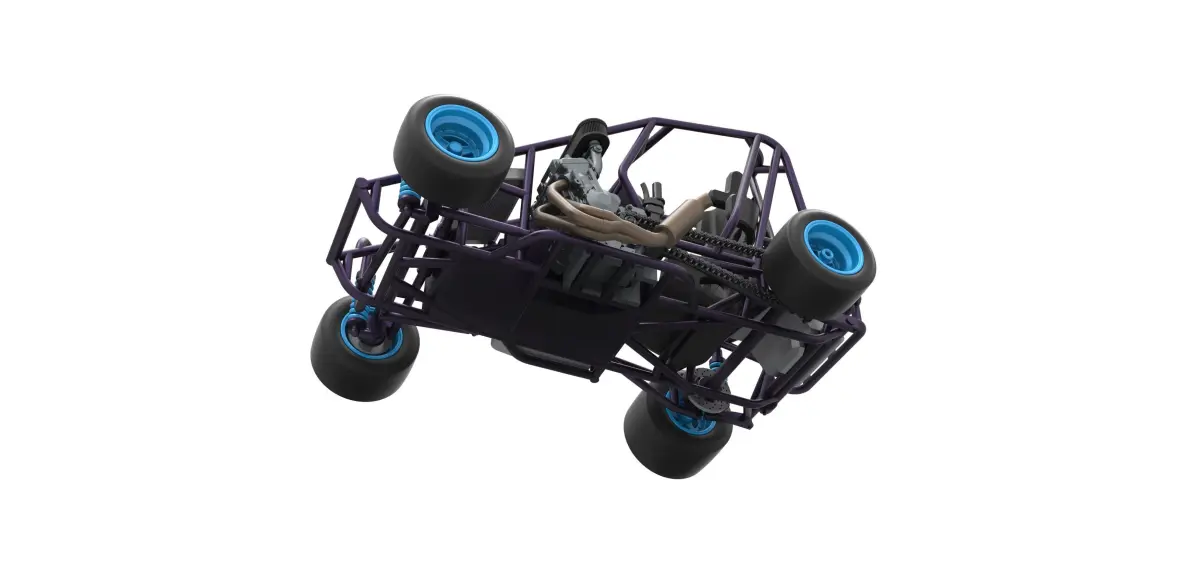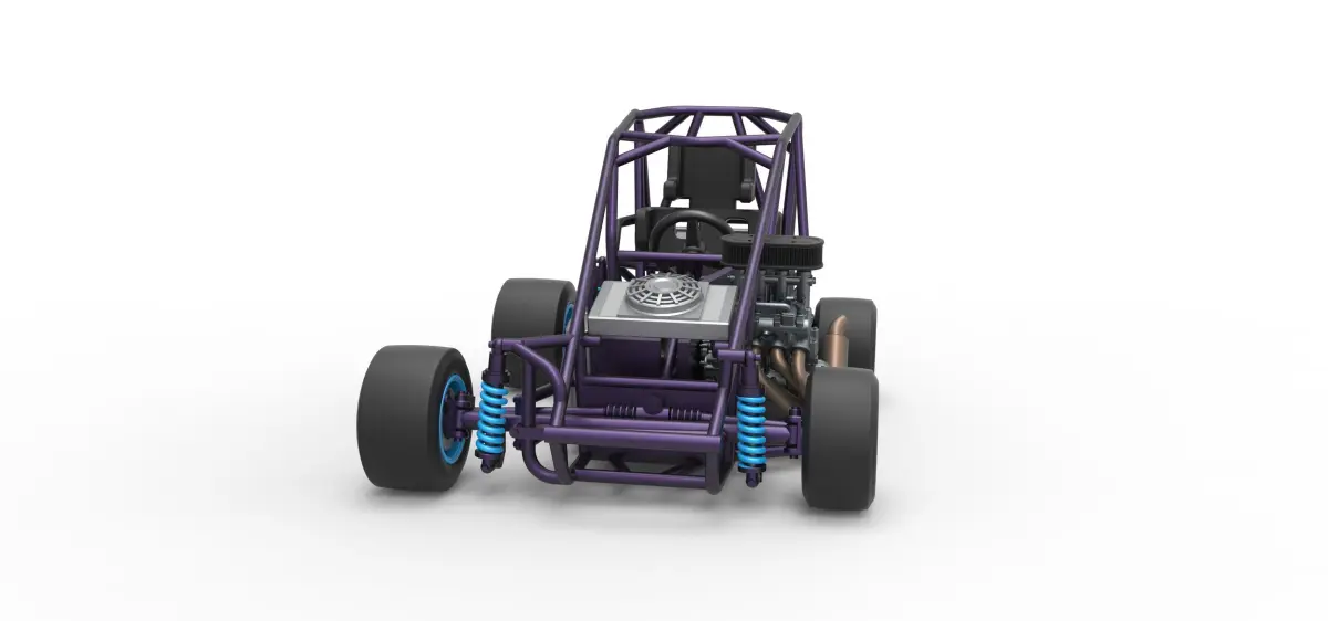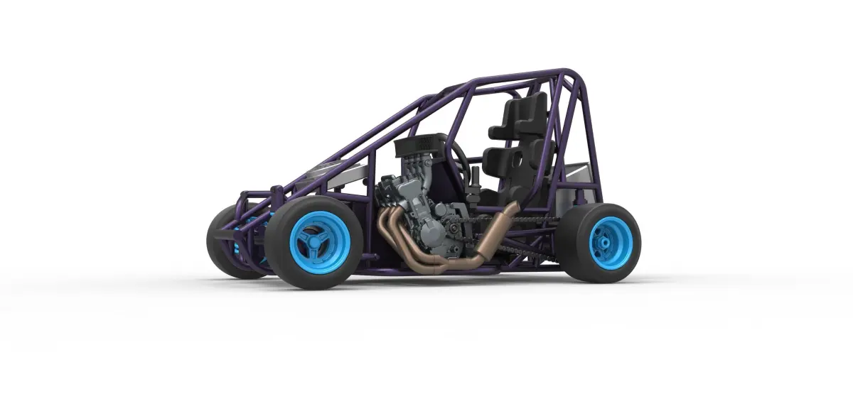 The model consists of parts: Air filter, Body, Engine, Exhaust pipes, Front left rim, Front left tire, Front right rim, Front right tire, Main gear, Radiator, Rear left rim, Rear left tire, Rear right rim, Rear right tire, Rear tank, Seat part 1,2, Shifter, Side tank, Spacer, Steering wheel.