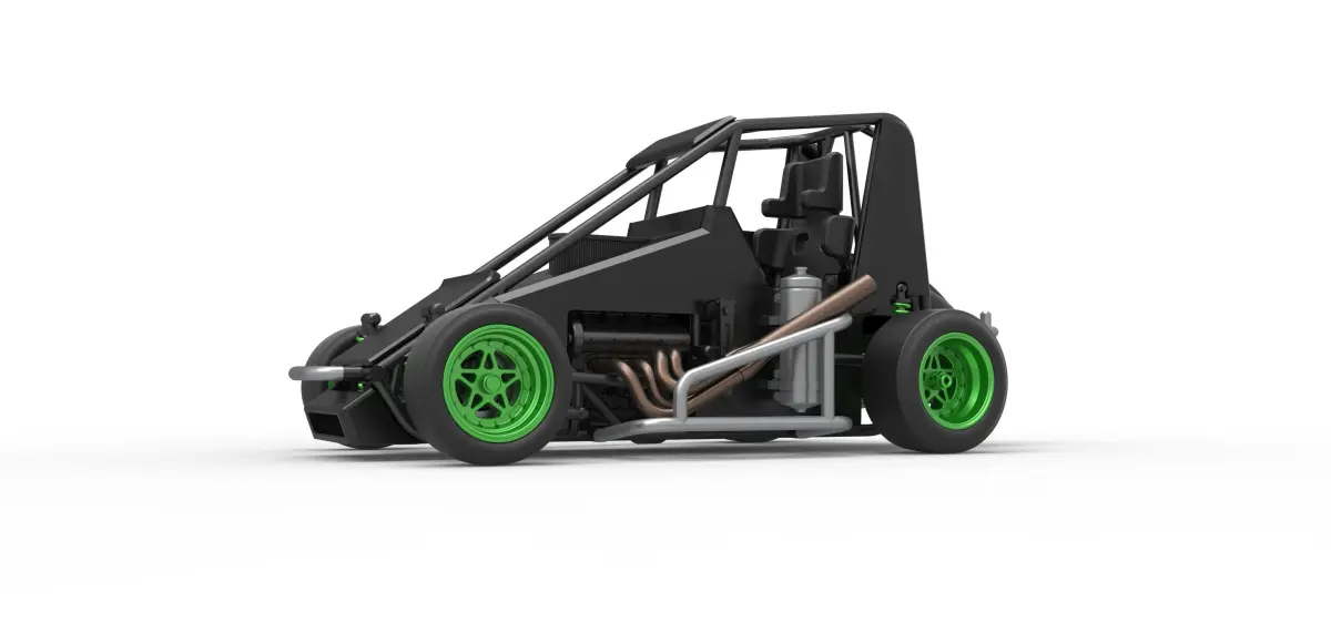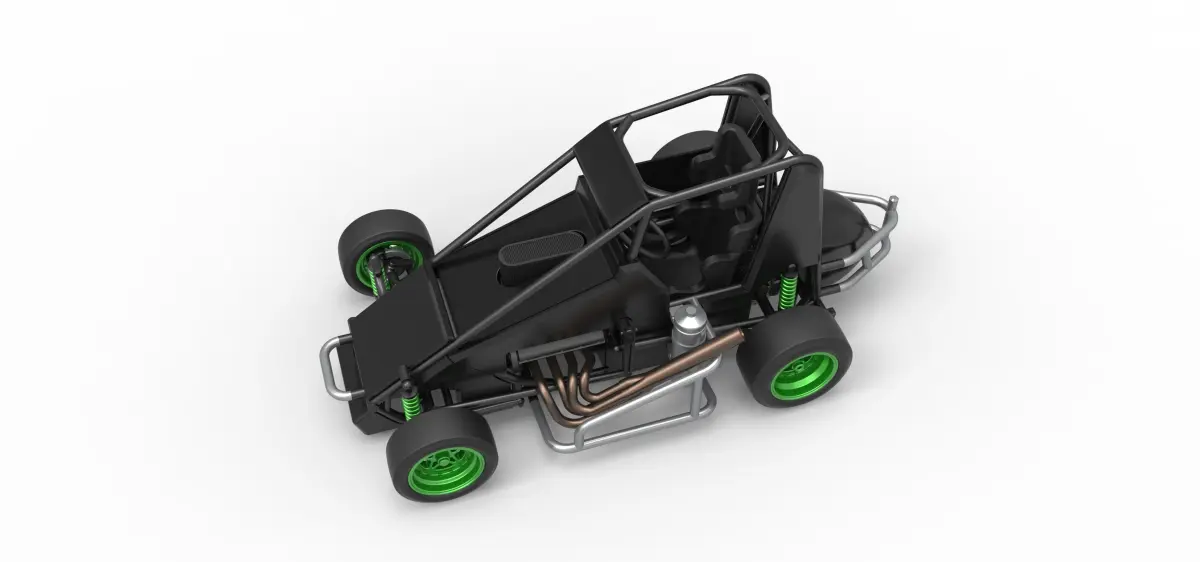 The model consists of parts: Air filter, Air intake, Body, Engine, Exhaust pipes part 1,2, Front rims, Front tires, Fuel tank, Oil tank, Radiator, Rear left rim, Rear left tire, Rear right rim, Rear right tire, Seat part 1,2, Shell central part 1-4, Shell left part 1-5, Shell right part 1-3, Steering wheel.