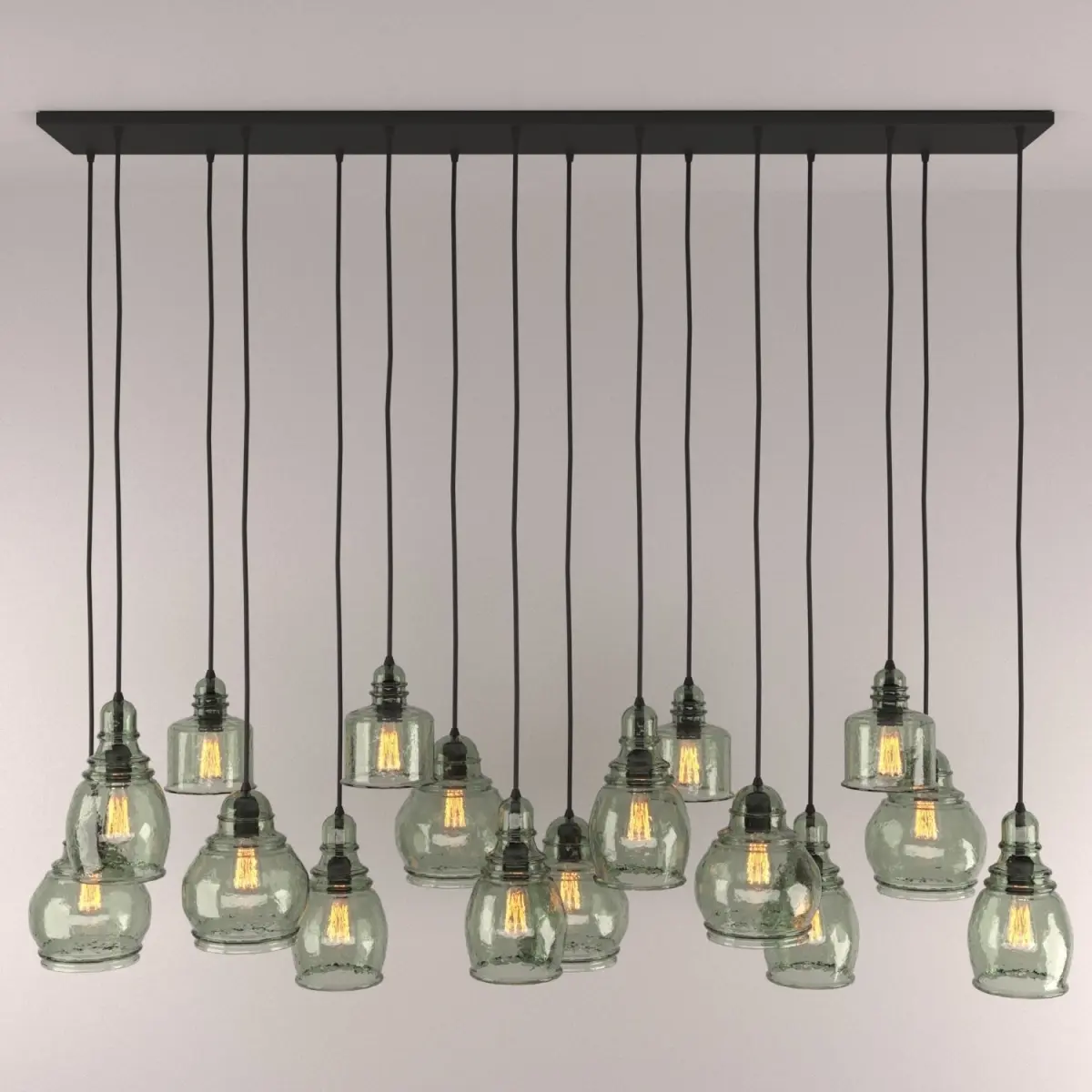 -Crafted of blown glass and steel with a Bronze finish.-Ideal ceiling height for pendant is 12'; cords are not adjustable.-Each glass shade is suspended from a rectangular canopy on black fabric cords of different lengths.-KEY PRODUCT POINTS-Hardwire; professional installation.-UL-listed.-Imported.