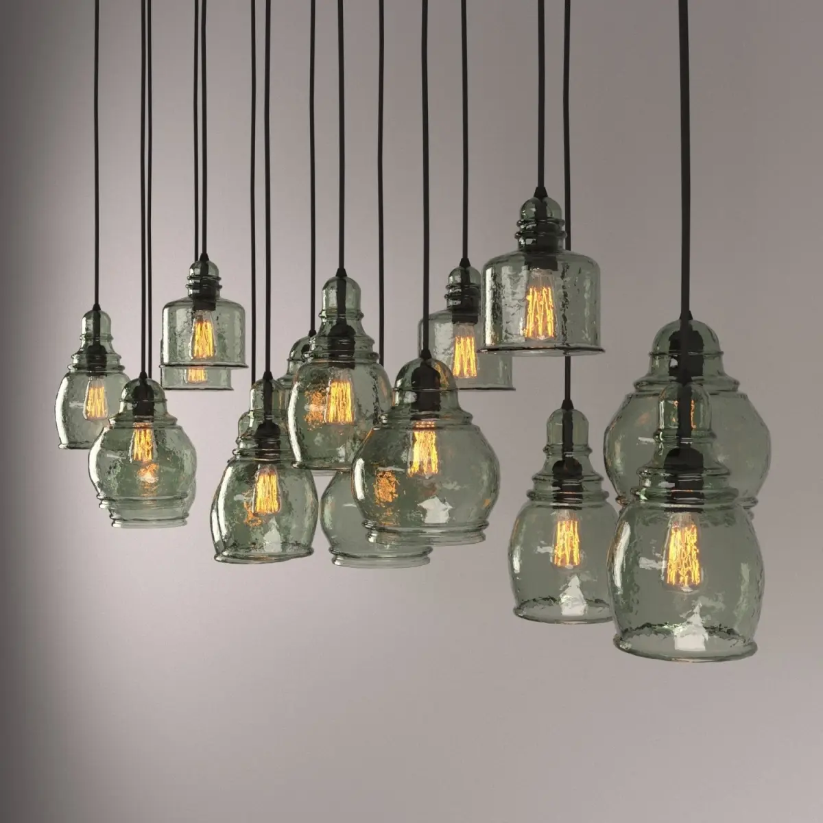 Scaled especially for high ceilings, our Paxton Pendant is a show-stopping piece. The shades are crafted of blown glass in eclectic shapes and feature a mottled texture with a subtle green hue.