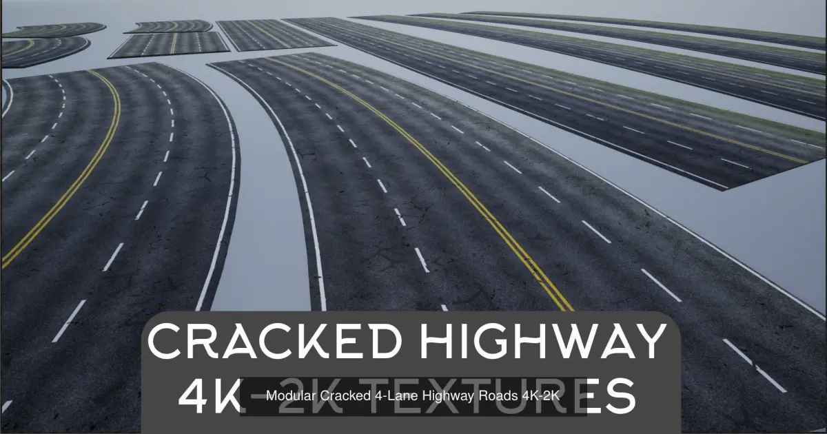 - Four Lane Road Cracked Wet Textures Albedo,Normal,AO,Roughness,displacement,Mask(4096x2048) 4K