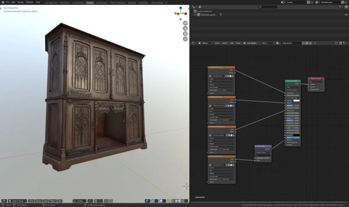 - Wardrobe_gothicU.fbx (contains proper collision sub-objects)- Wardrobe_gothic_ARM.tga - Ambient (Red channel), Roughness (Green channel), Metallic (Blue channel).- Wardrobe_gothic_D.tga - Albedo- Wardrobe_gothic_N.tga - Normal Map