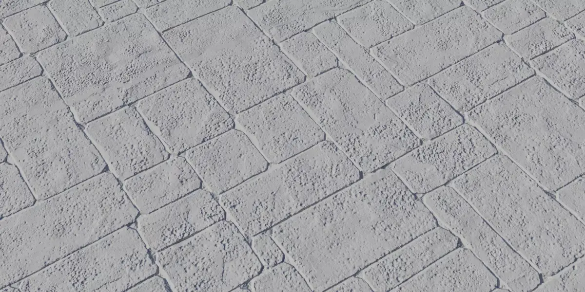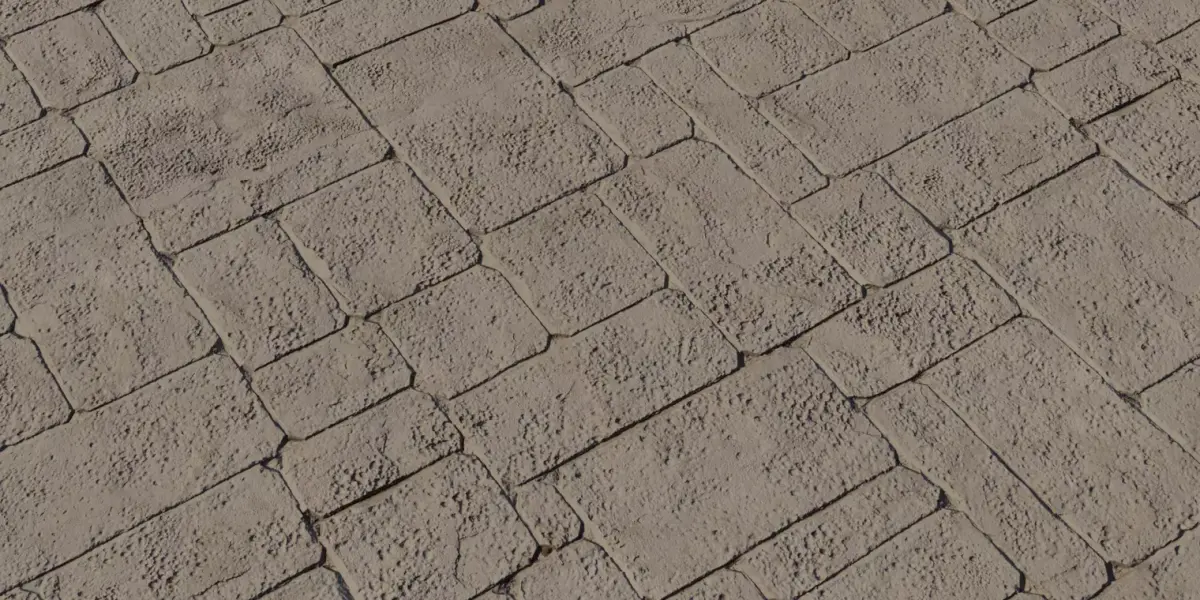 Scale: block size and patterning authored for ~1×1 m tiles consistent with real plaza paving and streets; adjust UVs for zoomed-in hero shots or more repetitive layouts.