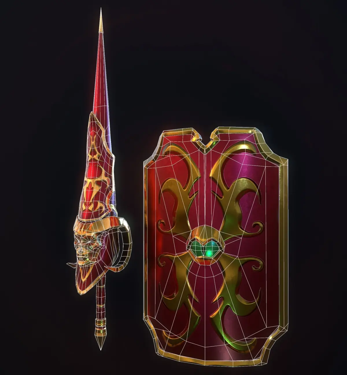 Game ready PBR low-poly fantasy props available in four color variations - blue-silver, red-bronze, green-steel and black-gold.