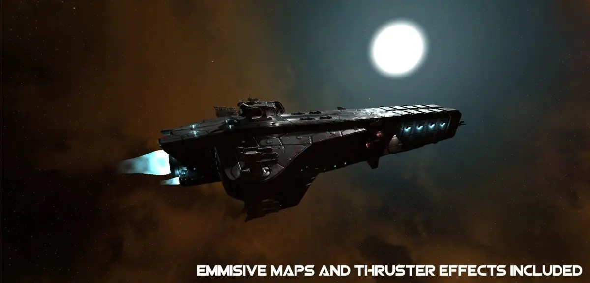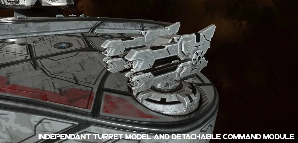 PBR ready light cruiser spaceship model complete with separate command module and battle turrets. Built primarily for Unity and includes thruster vfx and demo scene. The command module can be separated from the main body and has it's own thruster bays. All maps are in 4096x4096 resolution.