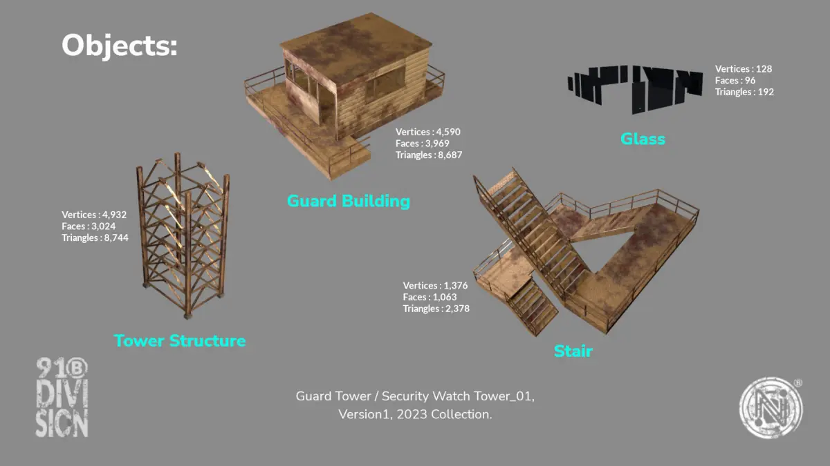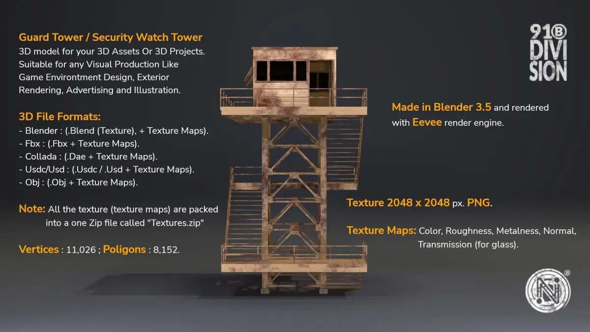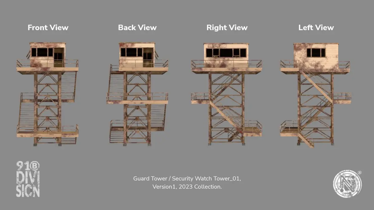 Guard Tower / Security Watch Tower (Cream Rusted) 3D model for your 3D Assets or 3D Projects. Suitable for any Visual Production like Game Environtment Design, Exterior Rendering, Advertising and Illustration. Made in Blender 3.5 and rendered with Eevee render engine.