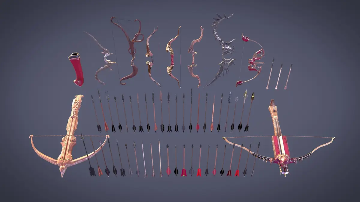 Organic and Bone-Inspired Bows: With natural curves and textures resembling animal bones or horns.Metallic and Ornamental Bows: Featuring gilded accents, engraved wings, and intricate patterns, some resembling mythological creatures like dragons.Gothic and Sinister Designs: With dark, spiked motifs, crescent shapes, and intricate metallic frames.Futuristic or Sci-Fi Bows: With angular, modern, and sleek aesthetics, likely involving advanced materials and designs.